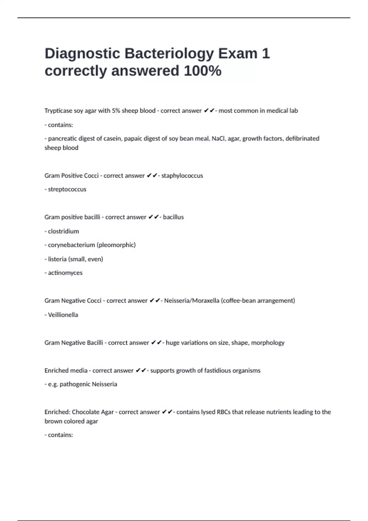 Enriched: Chocolate Agar - correct answer ✔✔- contains lysed RBCs that release nutrients leading to the