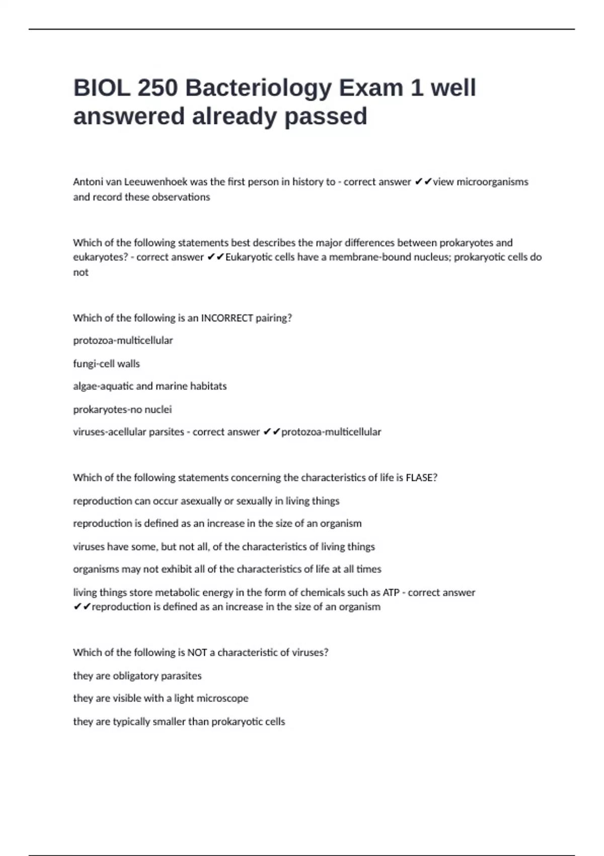 BIOL 250 Bacteriology Exam 1 well answered already passed
