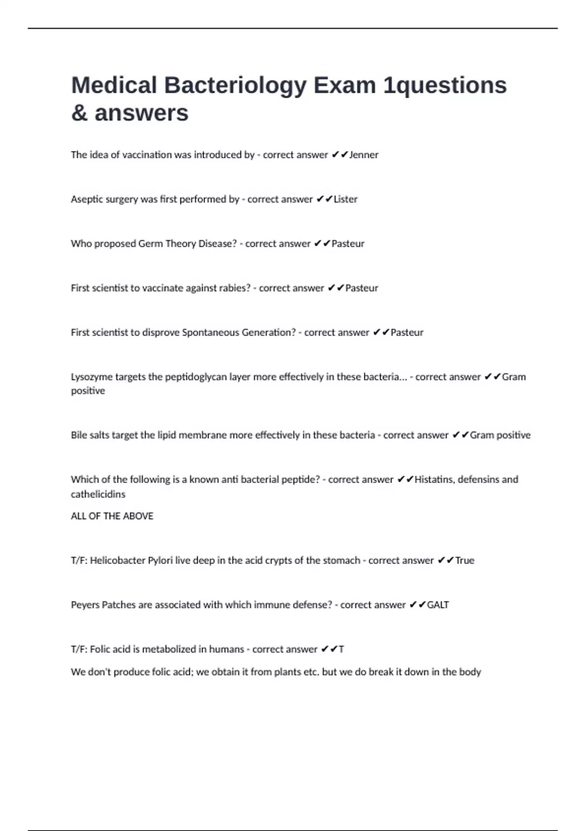Which of the following is a known anti bacterial peptide? - correct answer ✔✔Histatins, defensins and