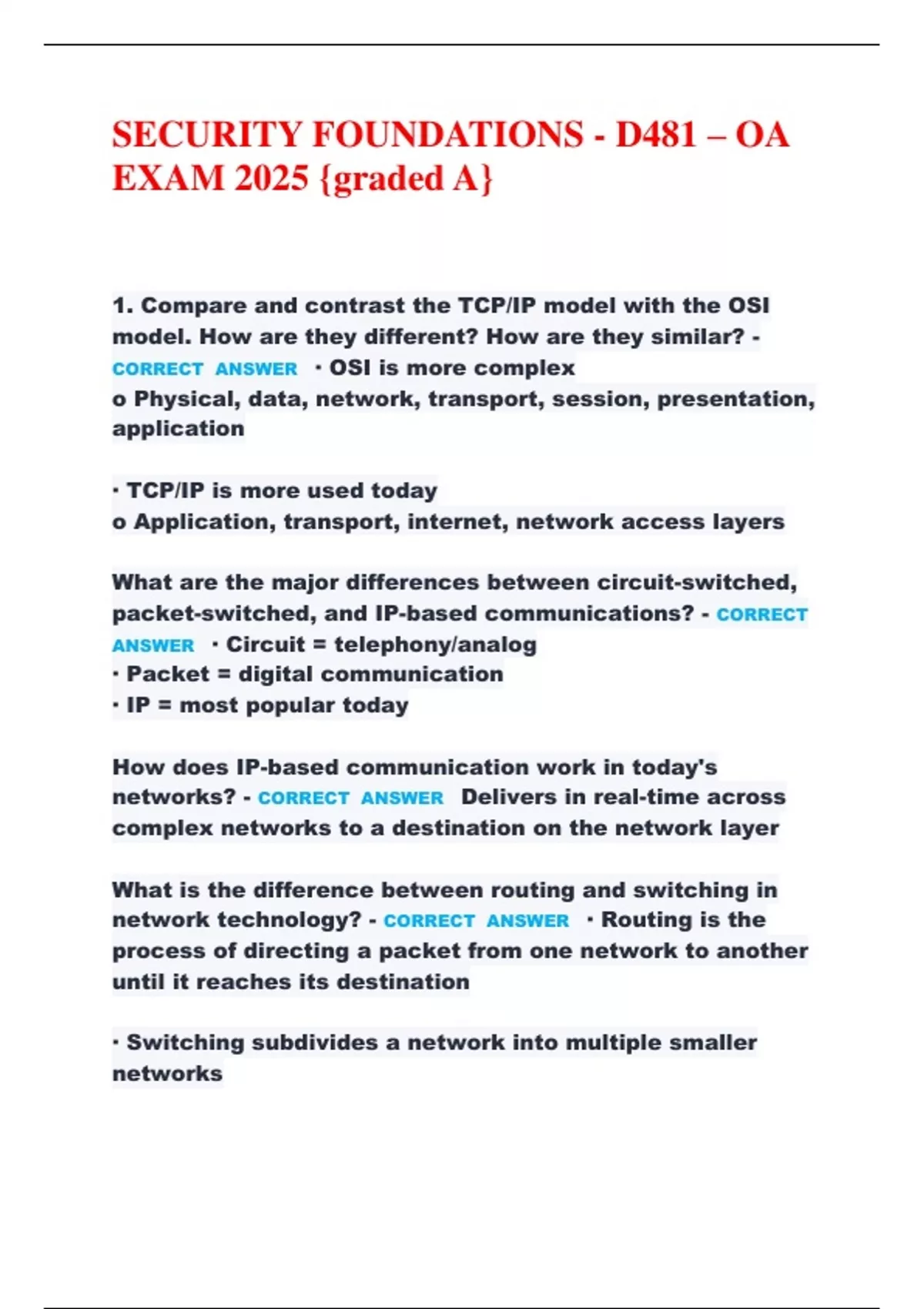 SECURITY FOUNDATIONS - D481 – OA EXAM 2025 {graded A} 1. Compare and contrast the TCP/IP model with the OSI model. How are they different? How are they similar? - CORRECT ANSWER · OSI is more complex o Physical, data, network, transport, session, presentation, application · TCP/IP is more used today o Application, transport, internet, network access layers What are the major differences between circuit-switched, packet-switched, and IP-based communications? - CORRECT ANSWER · Circuit = telephony/analog · Packet = digital communication · IP = most popular today How does IP-based communication work in today's networks?