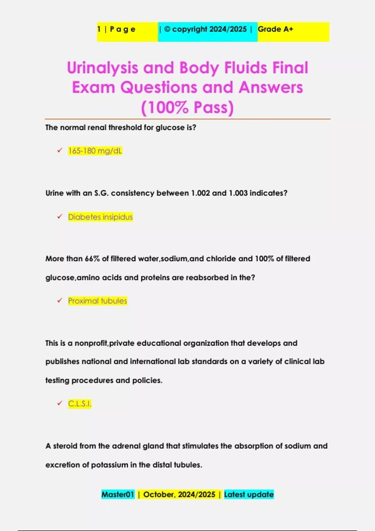 Urinalysis and Body Fluids Final Exam Questions and Answers (100% Pass)