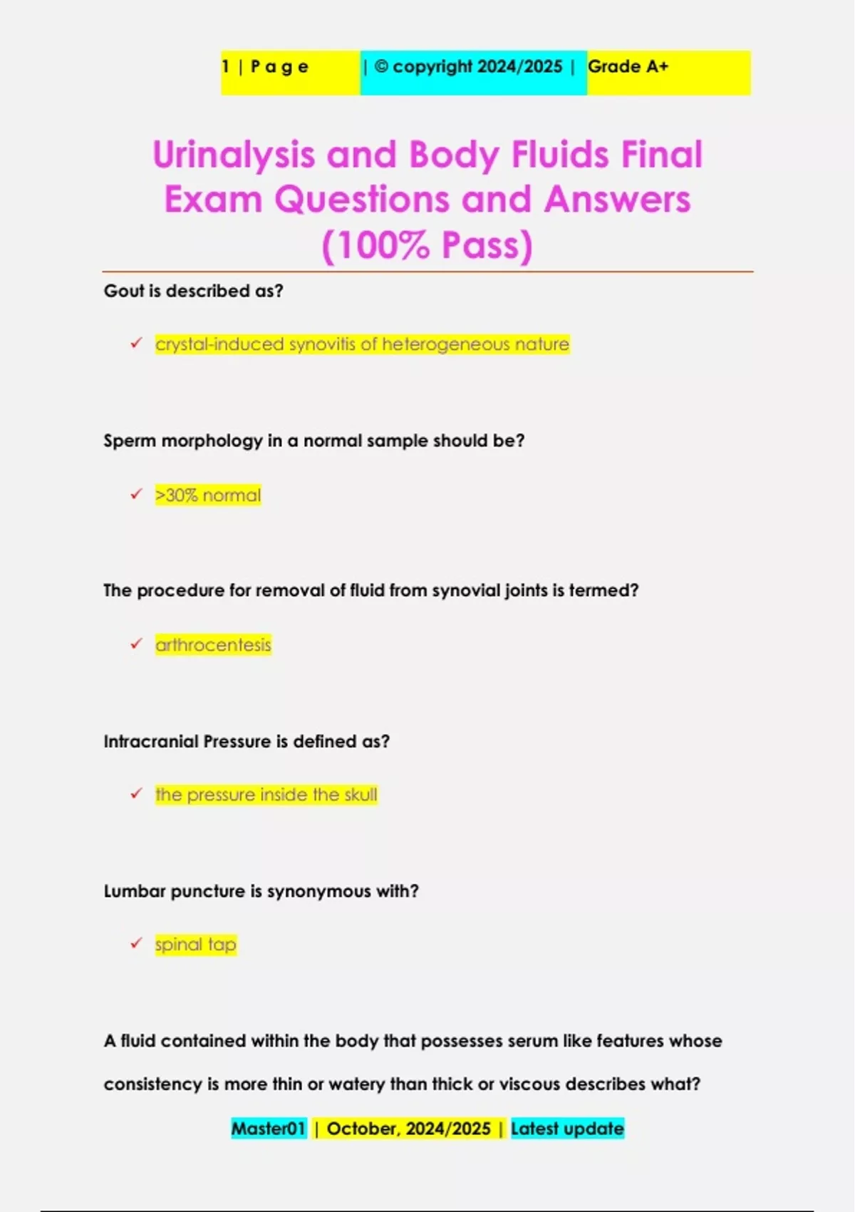 Urinalysis and Body Fluids Final Exam Questions and Answers (100% Pass)