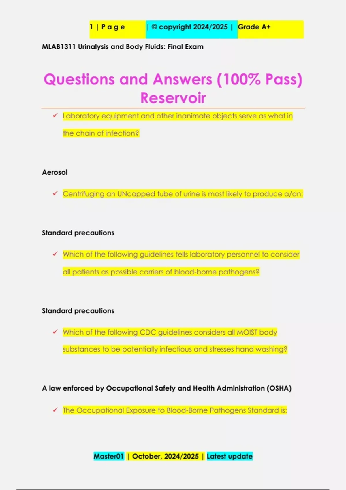 MLAB1311 Urinalysis and Body Fluids: Final Exam