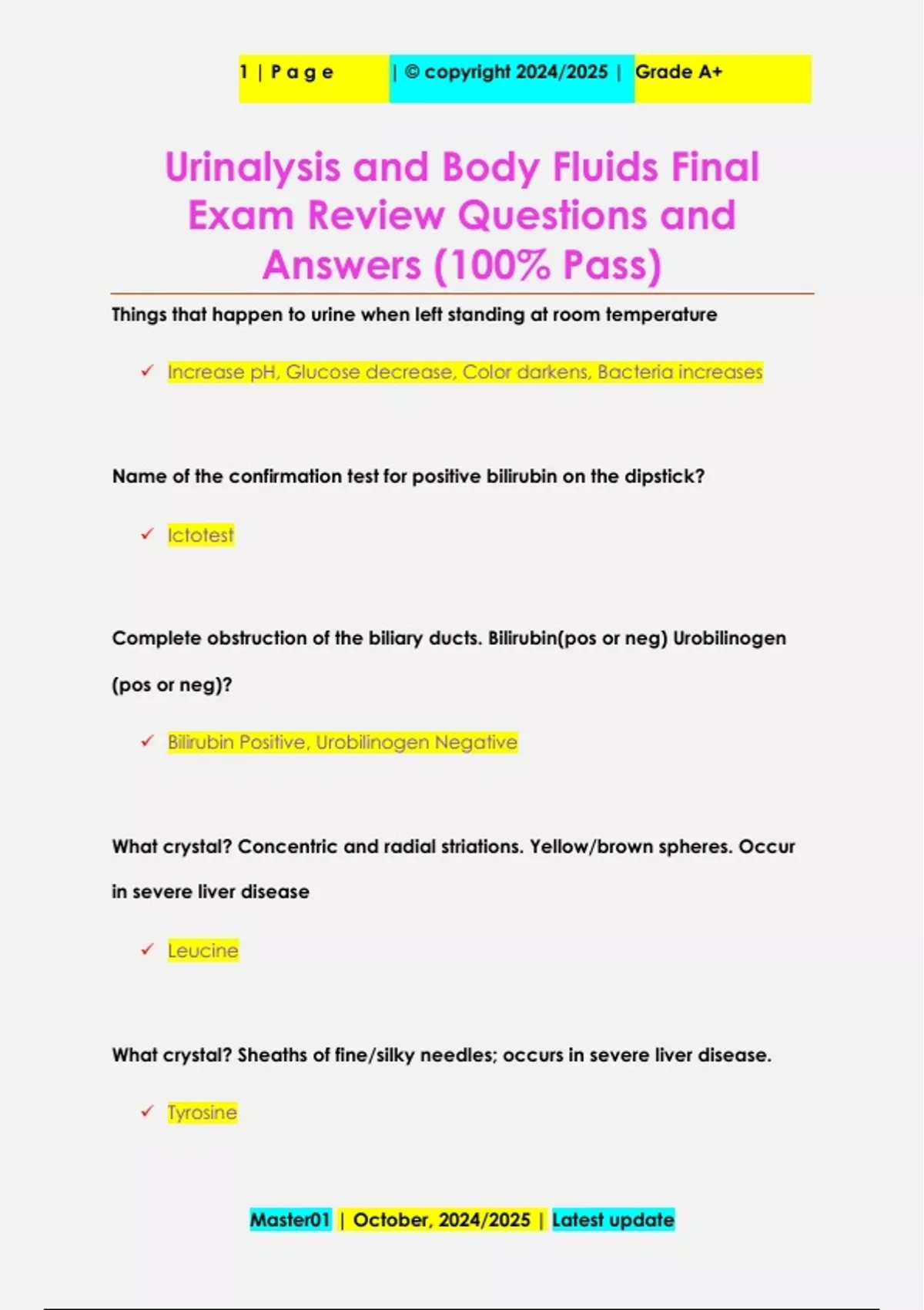 Urinalysis and Body Fluids Final Exam Review Questions and Answers