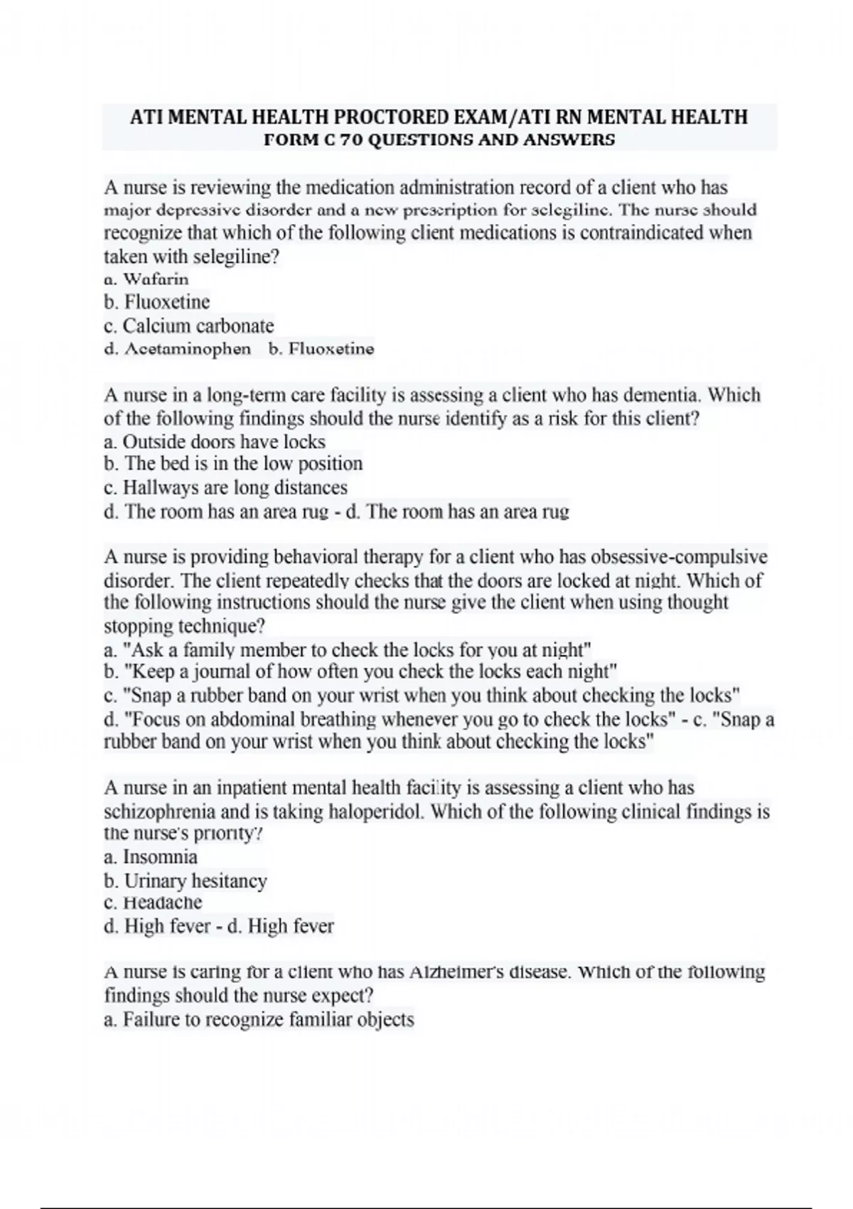 ATI MENTAL HEALTH PROCTORED EXAM/ATI RN MENTAL HEALTH FORM C 70 QUESTIONS AND ANSWERS