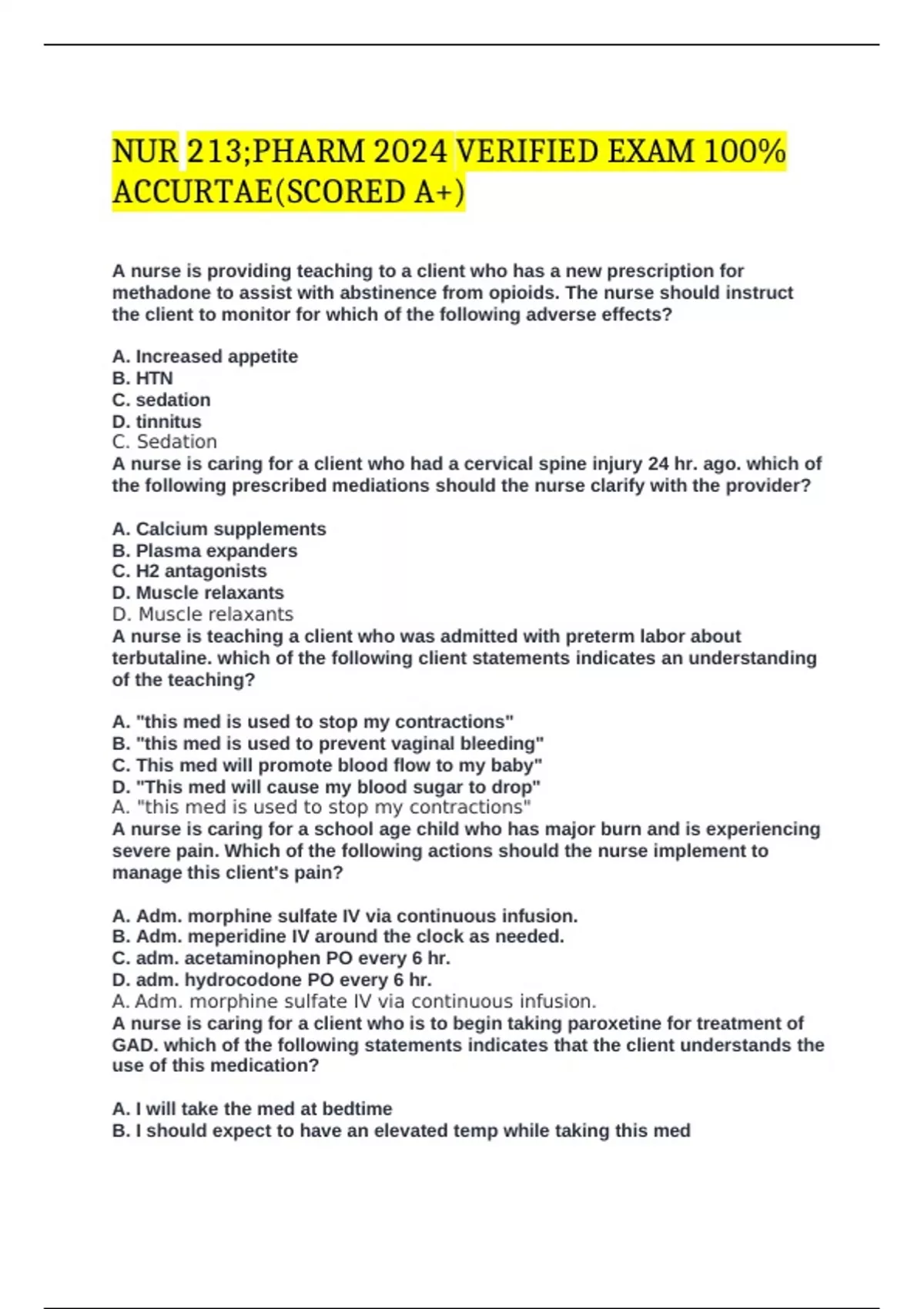 NUR 213;PHARM 2024 VERIFIED EXAM 100% ACCURTAE(SCORED A+) A nurse is providing teaching to a client who has a new prescription for methadone to assist with abstinence from opioids. The nurse should instruct the client to monitor for which of the following adverse effects? A. Increased appetite B. HTN C. sedation D. tinnitus C. Sedation A nurse is caring for a client who had a cervical spine injury 24 hr. ago. which of the following prescribed mediations should the nurse clarify with the provider? A. Calcium supplements B. Plasma expanders C. H2 antagonists D. Muscle relaxants D. Muscle relaxants A nurse is teaching a client who was admitted with preterm labor about terbutaline. which of the following client statements indicates an understanding of the teaching? A. "this med is used to stop my contractions" B. "this med is used to prevent vaginal bleeding" C. This med will promote blood flow to my baby" D. "This med will cause my blood sugar to drop" A. "this med is used to stop my contractions" A nurse is caring for a school age child who has major burn and is experiencing severe pain. Which of the following actions should the nurse implement to manage this client's pain? A. Adm. morphine sulfate IV via continuous infusion. B. Adm. meperidine IV around the clock as needed. C. adm. acetaminophen PO every 6 hr. D. adm. hydrocodone PO every 6 hr. A. Adm. morphine sulfate IV via continuous infusion. A nurse is caring for a client who is to begin taking paroxetine for treatment of GAD. which of the following statements indicates that the client understands the use of this medication? A. I will take the med at bedtime B.
