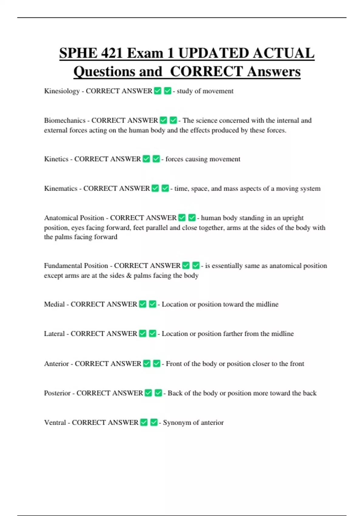 SPHE 421 Exam 1 UPDATED ACTUAL Questions and CORRECT Answers Kinesiology - CORRECT ANSWER - study of movement Biomechanics - CORRECT ANSWER - The science concerned with the internal and external forces acting on the human body and the effects produced by these forces. Kinetics - CORRECT ANSWER - forces causing movement