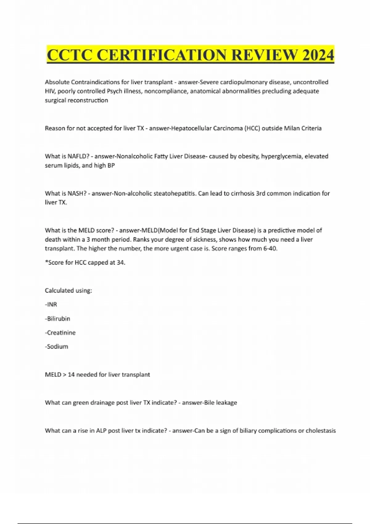 CCTC CERTIFICATION REVIEW 2024 Absolute Contraindications for liver transplant - answer-Severe cardiopulmonary disease, uncontrolled HIV, poorly controlled Psych illness, noncompliance, anatomical abnormalities precluding adequate surgical reconstruction Reason for not accepted for liver TX - answer-Hepatocellular Carcinoma (HCC) outside Milan Criteria What is NAFLD? - answer-Nonalcoholic Fatty Liver Disease- caused by obesity, hyperglycemia, elevated serum lipids, and high BP What is NASH? - answer-Non-alcoholic steatohepatitis. Can lead to cirrhosis 3rd common indication for liver TX. What is the MELD score? - answer-MELD(Model for End Stage Liver Disease) is a predictive model of death within a 3 month period. Ranks your degree of sickness, shows how much you need a liver transplant. The higher the number, the more urgent case is. Score ranges from 6-40. *Score for HCC capped at 34. Calculated using: -INR -Bilirubin -Creatinine -Sodium MELD > 14 needed for liver transplant
