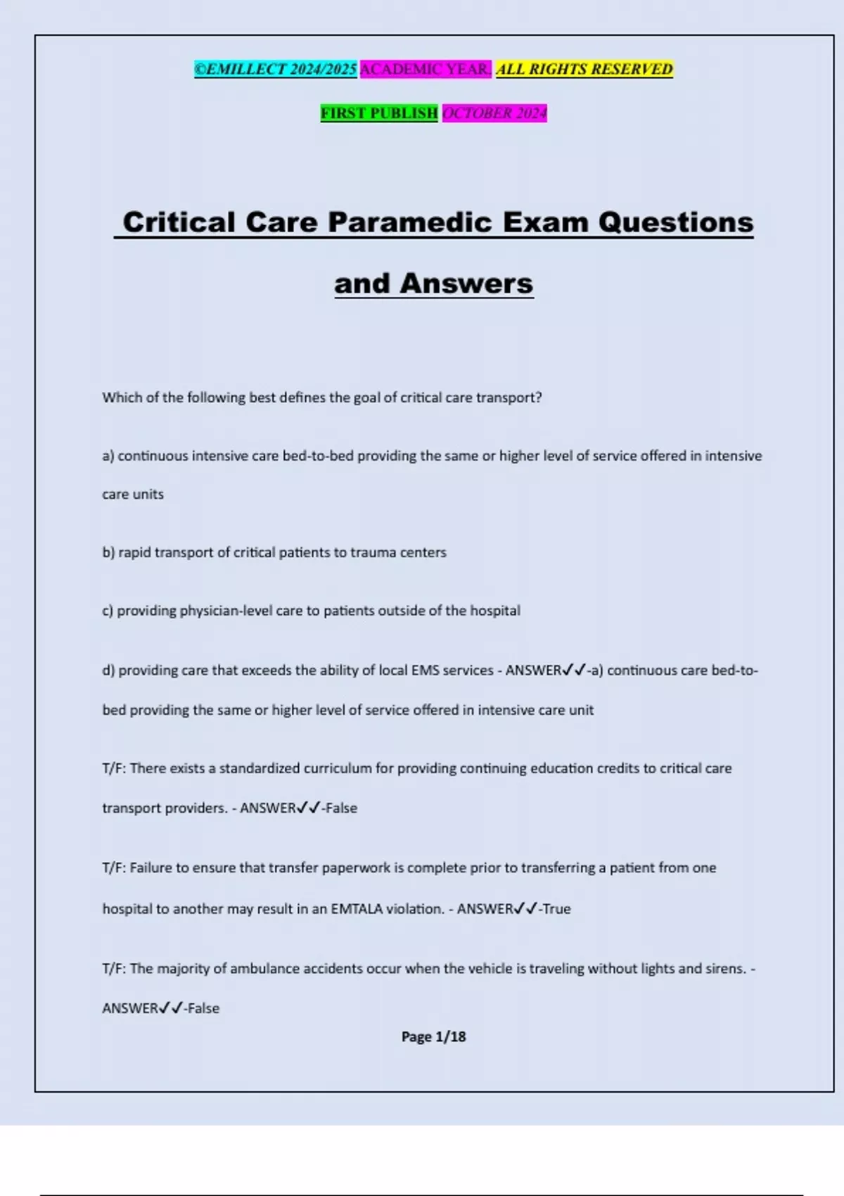 Critical Care Paramedic Exam Questions and Answers Which of the following best defines the goal of critical care transport? a) continuous intensive care bed-to-bed providing the same or higher level of service offered in intensive care units b) rapid transport of critical patients to trauma centers c) providing physician-level care to patients outside of the hospital d) providing care that exceeds the ability of local EMS services - ANSWER-a) continuous care bed-to- bed providing the same or higher level of service offered in intensive care unit T/F: There exists a standardized curriculum for providing continuing education credits to critical care transport providers. - ANSWER-False T/F: Failure to ensure that transfer paperwork is complete prior to transferring a patient from one hospital to another may result in an EMTALA violation. - ANSWER-True T/F: The majority of ambulance accidents occur when the vehicle is traveling without lights and sirens. - ANSWER-False ©EMILLECT 2024/2025 ACADEMIC YEAR. ALL RIGHTS RESERVED FIRST PUBLISH OCTOBER 2024 Page 2/18 T/F: Federal law requires that all emergency personnel working on roadways must wear fluorescent and retro-reflective vests. - ANSWER-True T/F: The critical care transport providers must always assume responsibility and accountability for his or her actions. - ANSWER-True Although debated by historians, the first air medical transport could have occurred in which of the following military conflicts? a) Vietnam War b) Civil War c) Prussian Siege of Paris d) World War I - ANSWER-c) Prussian Siege of Paris The first helicopter evacuation of a wounded soldier occurred in which of the following military conflicts? a) World War I b) World War II c) Korean War d) Vietnam War - ANSWER-b) World War II ©EMILLECT 2024/2025 ACADEMIC YEAR. ALL RIGHTS RESERVED FIRST PUBLISH OCTOBER 2024 Page 3/18 Rotor-wing transport is typically used for transports less than ___ nautical miles. - ANSWER-c) 150 T/F: Air medical accidents are usually caused by a single event. - ANSWER-False List the four major contributing factors to HEMS crash as identified by the NTSB. - ANSWER-I) Human error II) Weather III) Mechanical failure IV) Obstacle strikes T/F: Weather has been frequently found to be the primary causes of HEMS accidents. - ANSWER- False Briefly describe the "cardinal sin" of requesting air medical transport. - ANSWER-Having the patient transported by air when they could have reached an appropriate hospital by ground transport. __ minutes or __ minute ground transport time is considered to be the minimum to which air medical transport is beneficial to the patient (with few exceptions such as extended extrication, weather, traffic, etc.). - ANSWER-30, 30 Which of the following is a DEBATABLE criteria for the use of HEMS? a) death of an occupant in the vehicle ©EMILLECT 2024/2025 ACADEMIC YEAR. ALL RIGHTS RESERVED FIRST PUBLISH OCTOBER 2024 Page 4/18 b) ejection from a vehicle c) GCS <10 d) fracture with vascular compromise - ANSWER-a) death of an occupant in the vehicle Describe the term "helicopter shopping?" - ANSWER-when sequential calls are made to numerous air medical providers in an attempt to find one to take a mission when it has been declined by others Briefly describe the "51% rule." - ANSWER-allows any crew member the right to decline a flight without fear of repercussion from administration or other crew members What is the ideal size for a helicopter landing zone? - ANSWER-b) 100x100 The slope of the landing zone cannot exceed ___ degrees. - ANSWER-b) 5 Most aircraft are designed to approach the aircraft from a ___ degree angle to the doors. - A