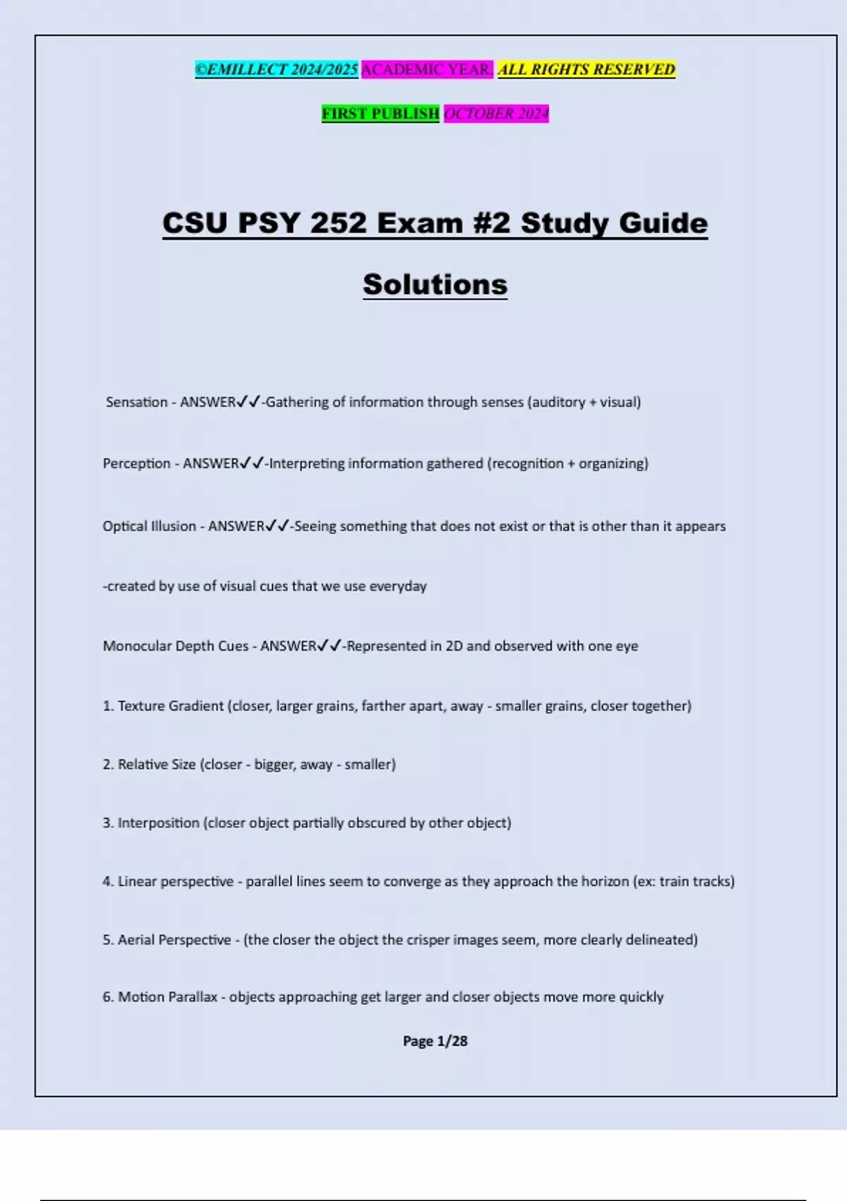 CSU PSY 252 Exam #2 Study Guide Solutions Sensation - ANSWER-Gathering of information through senses (auditory + visual) Perception - ANSWER-Interpreting information gathered (recognition + organizing) Optical Illusion - ANSWER-Seeing something that does not exist or that is other than it appears -created by use of visual cues that we use everyday Monocular Depth Cues - ANSWER-Represented in 2D and observed with one eye 1. Texture Gradient (closer, larger grains, farther apart, away - smaller grains, closer together) 2. Relative Size (closer - bigger, away - smaller) 3. Interposition (closer object partially obscured by other object) 4. Linear perspective - parallel lines seem to converge as they approach the horizon (ex: train tracks) 5. Aerial Perspective - (the closer the object the crisper images seem, more clearly delineated) 6. Motion Parallax - objects approaching get larger and closer objects move more quickly ©EMILLECT 2024/2025 ACADEMIC YEAR. ALL RIGHTS RESERVED FIRST PUBLISH OCTOBER 2024 Page 2/28 Binocular Depth Cues - ANSWER-Using 2 eyes, 3D 1. Binocular convergence - Closer the object, the more eyes must turn inward - muscles send messages to the brain regarding degree eyes are turning inward - These messages are interpreted as cues indicating depth 2. Binocular Disparity - Closer an object, the greater the disparity between the views of it as sensed by each eye - apparent jumping of images between the two eyes, which indicated amount of binocular disparity decreases with distance Gestalt Psychology (principles related) - ANSWER-Goals: address directly the more global, holistic processes involved in perceiving structure in the environment (describe phenomenon, but doesn't explain it) - Figure-ground: Figure=prominent object, ground=background - Proximity: perceive objects that are close to each other as forming a group - Similarity - perceive objects that are similar to each other as forming a