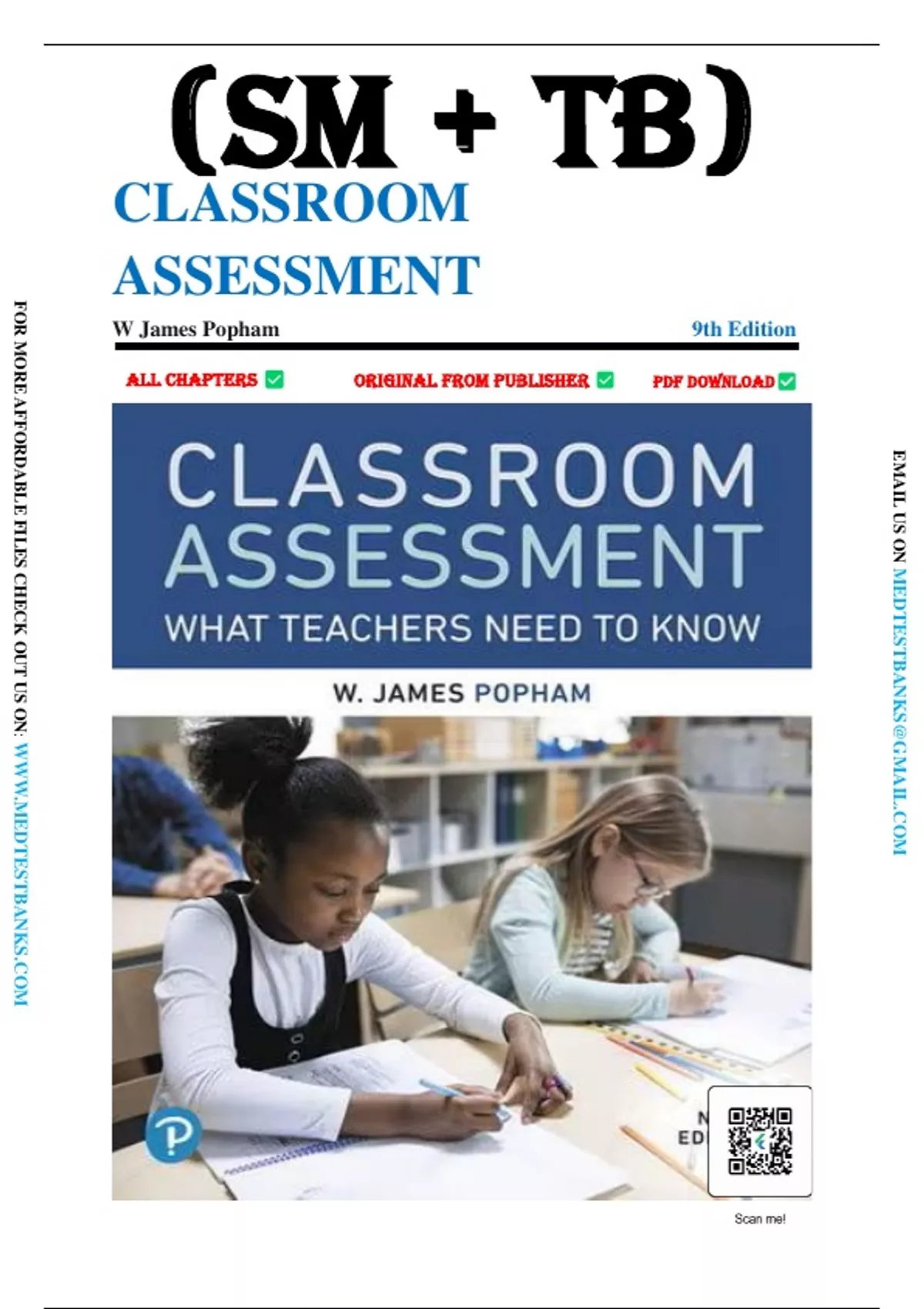Solutions Manual and Test Bank for Classroom Assessment What Teachers Need to Know 9th Edition By James Popham (All Chapters 1-16). Why Do Teachers Need to Know About Assessment? Deciding What to Assess Reliability of Assessment Validity Fairness Selected-Response Tests Constructed-Response Tests Performance Assessment Portfolio Assessment Affective Assessment Improving Teacher-Developed Assessments Formative Assessment Making Sense Out of Standardized Test Scores Appropriate and Inappropriate Test-Preparation Practices The Evaluation of Instruction Assessment-Based Grading