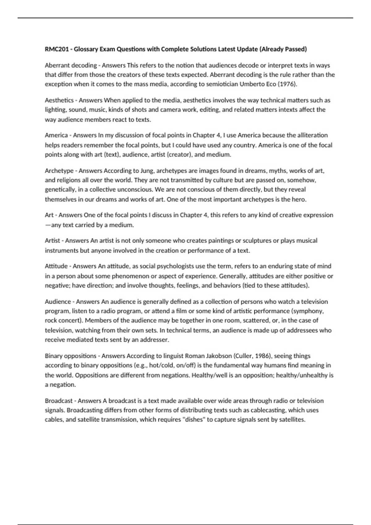 RMC201 - Glossary Exam Questions with Complete Solutions Latest Update (Already Passed) Aberrant decoding - Answers This refers to the notion that audiences decode or interpret texts in ways that differ from those the creators of these texts expected. Aberrant decoding is the rule rather than the exception when it comes to the mass media, according to semiotician Umberto Eco (1976). Aesthetics - Answers When applied to the media, aesthetics involves the way technical matters such as lighting, sound, music, kinds of shots and camera work, editing, and related matters intexts affect the way audience members react to texts. America - Answers In my discussion of focal points in Chapter 4, I use America because the alliteration helps readers remember the focal points, but I could have used any country. America is one of the focal points along with art (text), audience, artist (creator), and medium. Archetype - Answers According to Jung, archetypes are images found in dreams, myths, works of art, and religions all over the world. They are not transmitted by culture but are passed on, somehow, genetically, in a collective unconscious. We are not conscious of them directly, but they reveal themselves in our dreams and works of art. One of the most important archetypes is the hero. Art - Answers One of the focal points I discuss in Chapter 4, this refers to any kind of creative expression—any text carried by a medium. Artist - Answers An artist is not only someone who creates paintings or sculptures or plays musical instruments but anyone involved in the creation or performance of a text. Attitude - Answers An attitude, as social psychologists use the term, refers to an enduring state of mind in a person about some phenomenon or aspect of experience. Generally, attitudes are either positive or negative; have direction; and involve thoughts, feelings, and behaviors (tied to these attitudes). Audience - Answers An audience is generally defined as a collection of persons who watch a television program, listen to a radio program, or attend a film or some kind of artistic performance (symphony, rock concert). Members of the audience may be together in one room, scattered, or, in the case of television, watching from their own sets. In technical terms, an audience is made up of addressees who receive mediated texts sent by an addresser. Binary oppositions - Answers According to linguist Roman Jakobson (Culler, 1986), seeing things according to binary oppositions (e.g., hot/cold, on/off) is the fundamental way humans find meaning in the world. Oppositions are different from negations. Healthy/well is an opposition; healthy/unhealthy is a negation. Broadcast - Answers A broadcast is a text made available over wide areas through radio or television signals. Broadcasting differs from other forms of distributing texts such as cablecasting, which uses cables, and satellite transmission, which requires "dishes" to capture signals sent by satellites. Class - Answers From a linguistic standpoint, a class is any group of things that has something in common. We use the term to refer to social classes or, more literally, socioeconomic classes: groups of people who differ in terms of income and lifestyle. Marxist theorists argue that there is a ruling class that shapes the ideas of the proletariat, the working classes. Codes - Answers Codes are systems of symbols, letters, words, sounds, and so on that generate meaning. Language, for example, is a code. It uses combinations of letters that we call words to mean certain things. The relation between the word and the thing the word stands for is arbitrary, based on convention. In some cases, the term code is used to describe hidden meanings and disguised communication. Cognitive dissonance - Answers The term dissonance refers to sounds that clash with one another. According to psychologists, people wish to avoid ideas that challenge the ones they hold or that create conflict and other disagreeable feelings. Cognitive dissonance refers to ideas that conflict with people's views and generate psychological anxiety and displeasure. Communication - Answers There are many ways of understanding and using this term. For our purposes, communication is a process that involves the transmission of messages from senders to receivers. We often make a distinction between communication using language—verbal communication—and nonverbal communication that uses facial expressions, body language, and other means. Communications - Answers The plural of communication refers to what is communicated in contrast to the process of communication. Concept - Answers A concept is a general idea or notion that explains or helps us understand some phenomenon or phenomena. I make a distinction in this book among theories, concepts, and the application of concepts. Connotations - Answers This term deals with the ideas or cultural meanings associated with a term, an object, or some phenomenon. Connotation comes from the Latin term connotare, "to mark along with." It is different from denotation, which refers to the literal meaning of a term. Content analysis - Answers This is a methodology for obtaining statistical data from a collection of texts that are similar in some respect. Content analysis is a nonintrusive way of conducting research. Control group - Answers In experiments, the control group is left alone and doesn't experience any kind ofintervention, in contrast to the experimental group, to whom something is done. Thenthe two groups are compared to see whether significant differences are found in theexperimental group, which can then be attributed to the intervention. Critical discourse analysis - Answers A form of discourse analysis that focuses on the u