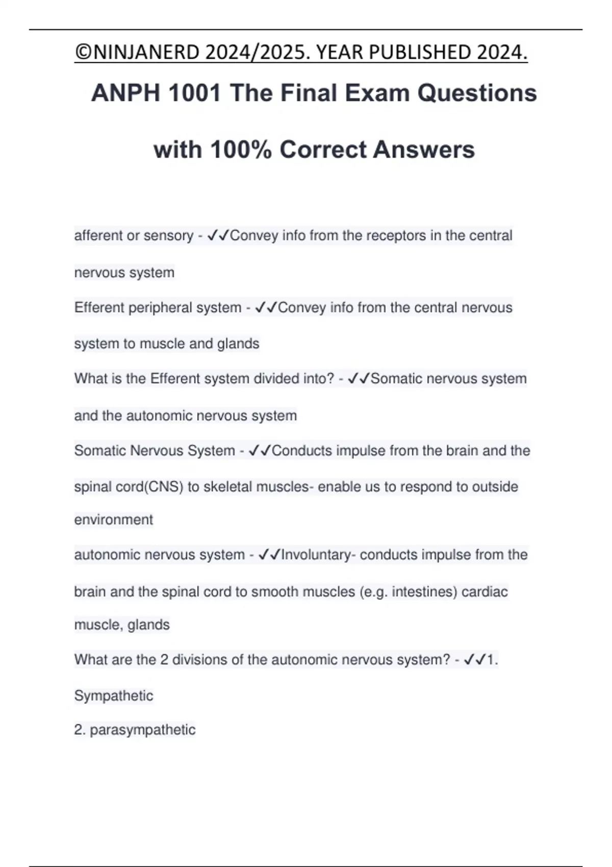 ANPH 1001 The Final Exam Questions with 100% Correct Answers afferent or sensory - Convey info from the receptors in the central nervous system Efferent peripheral system - Convey info from the central nervous system to muscle and glands What is the Efferent system divided into? - Somatic nervous system and the autonomic nervous system Somatic Nervous System - Conducts impulse from the brain and the spinal cord(CNS) to skeletal muscles- enable us to respond to outside environment autonomic nervous system - Involuntary- conducts impulse from the brain and the spinal cord to smooth muscles (e.g. intestines) cardiac muscle, glands What are the 2 divisions of the autonomic nervous system? - 1. Sympathetic 2. parasympathetic