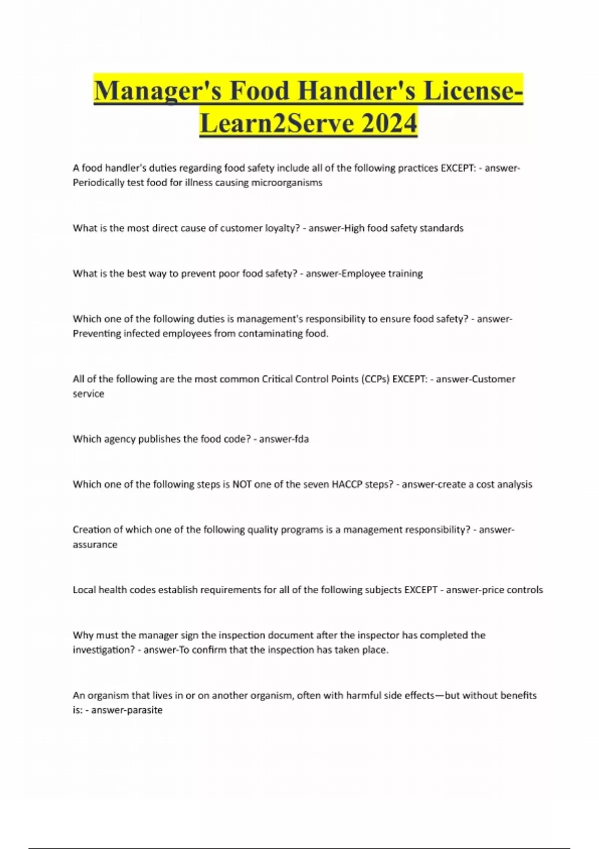 Manager's Food Handler's LicenseLearn2Serve 2024 A food handler's duties regarding food safety include all of the following practices EXCEPT: - answerPeriodically test food for illness causing microorganisms What is the most direct cause of customer loyalty? - answer-High food safety standards What is the best way to prevent poor food safety? - answer-Employee training Which one of the following duties is management's responsibility to ensure food safety? - answerPreventing infected employees from contaminating food. All of the following are the most common Critical Control Points (CCPs) EXCEPT: - answer-Customer service Which agency publishes the food code? - answer-fda Which one of the following steps is NOT one of the seven HACCP steps? - answer-create a cost analysis Creation of which one of the following quality programs is a management responsibility? - answerassurance Local health codes establish requirements for all of the following subjects EXCEPT - answer-price controls Why must the manager sign the inspection document after the inspector has completed the investigation? - answer-To confirm that the inspection has taken place. An organism that lives in or on another organism, often with harmful side effects—but without benefits is: - answer-parasite