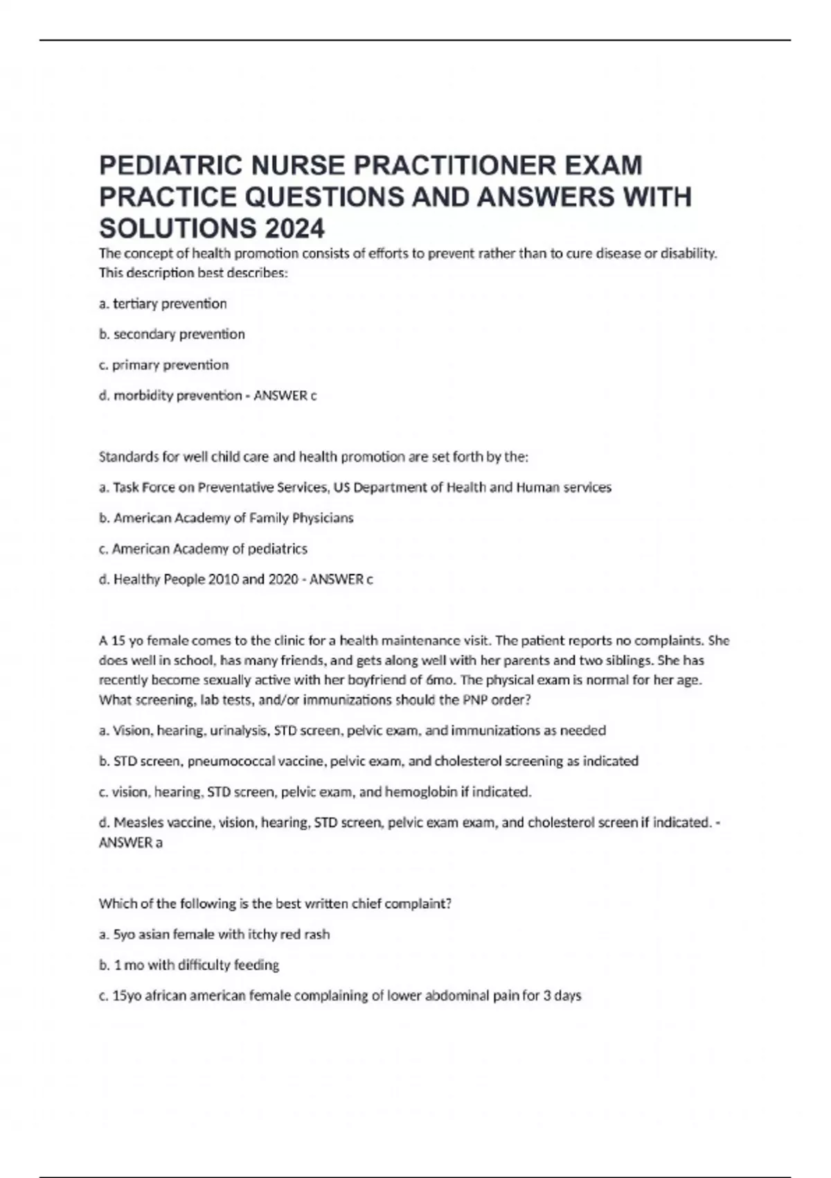 PEDIATRIC NURSE PRACTITIONER EXAM PRACTICE QUESTIONS AND ANSWERS WITH SOLUTIONS 2024 The concept of health promotion consists of efforts to prevent rather than to cure disease or disability. This description best describes: a. tertiary prevention b. secondary prevention c. primary prevention d. morbidity prevention - ANSWER c Standards for well child care and health promotion are set forth by the: a. Task Force on Preventative Services, US Department of Health and Human services b. American Academy of Family Physicians c. American Academy of pediatrics d. Healthy People 2010 and 2020 - ANSWER c A 15 yo female comes to the clinic for a health maintenance visit. The patient reports no complaints. She does well in school, has many friends, and gets along well with her parents and two siblings. She has recently become sexually active with her boyfriend of 6mo. The physical exam is normal for her age. What screening, lab tests, and/or immunizations should the PNP order? a. Vision, hearing, urinalysis, STD screen, pelvic exam, and immunizations as needed b. STD screen, pneumococcal vaccine, pelvic exam, and cholesterol screening as indicated c. vision, hearing, STD screen, pelvic exam, and hemoglobin if indicated. d. Measles vaccine, vision, hearing, STD screen, pelvic exam exam, and cholesterol screen if indicated. - ANSWER a Which of the following is the best written chief complaint? a. 5yo asian female with itchy red rash b. 1 mo with difficulty feeding c. 15yo african american female complaining of lower abdominal pain for 3 days d. 12yo caucasian with itchy eye for 1 week - ANSWER c The past history should include a. family history b. social hx c. symptom analysis d. hospitalization - ANSWER d The family history should include: a. the health status of the paternal grandparents b. the living conditions of the family c. the work status of the parents d. school information - ANSWER a Which of the following statements would be considered subjective data obtained from the client during the review of systems for the skin? a. the skin appears dry & excoriated b. a lesion is noted on the lateral aspect of the right leg c. there is moderate acne on the forehead and back d. the patient denies changes in skin texture - ANSWER d The PNP is completing the ROS on a 4mo. What response from the mother might indicate a cardiac problem in the infant & require a more thorough history? a. the baby gets the hiccups often. b. it takes the baby over 30min to complete a bottle c. the baby's heart seems to beat rapidly sometimes d. sometimes the baby sounds congested - ANSWER b