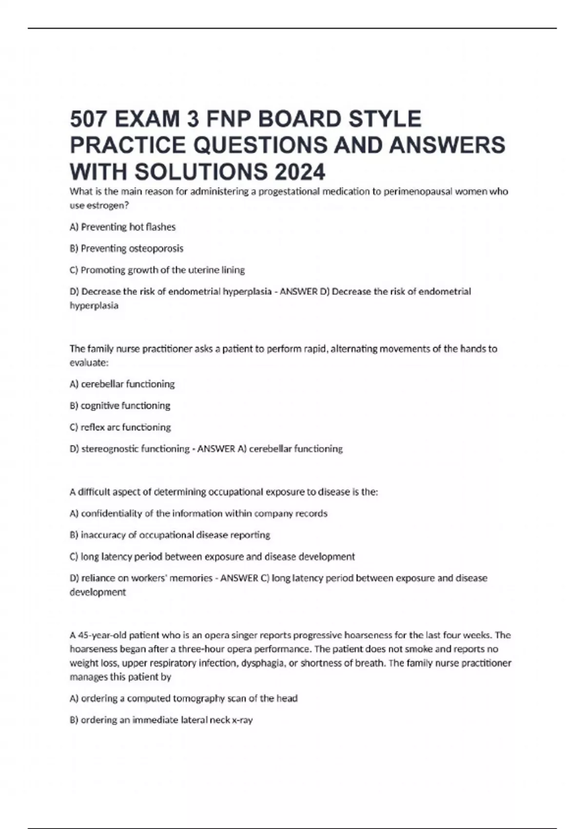 507 EXAM 3 FNP BOARD STYLE PRACTICE QUESTIONS AND ANSWERS WITH SOLUTIONS 2024 What is the main reason for administering a progestational medication to perimenopausal women who use estrogen? A) Preventing hot flashes B) Preventing osteoporosis C) Promoting growth of the uterine lining D) Decrease the risk of endometrial hyperplasia - ANSWER D) Decrease the risk of endometrial hyperplasia The family nurse practitioner asks a patient to perform rapid, alternating movements of the hands to evaluate: A) cerebellar functioning B) cognitive functioning C) reflex arc functioning D) stereognostic functioning - ANSWER A) cerebellar functioning A difficult aspect of determining occupational exposure to disease is the: A) confidentiality of the information within company records B) inaccuracy of occupational disease reporting C) long latency period between exposure and disease development D) reliance on workers' memories - ANSWER C) long latency period between exposure and disease development A 45-year-old patient who is an opera singer reports progressive hoarseness for the last four weeks. The hoarseness began after a three-hour opera performance. The patient does not smoke and reports no weight loss, upper respiratory infection, dysphagia, or shortness of breath. The family nurse practitioner manages this patient by A) ordering a computed tomography scan of the head B) ordering an immediate lateral neck x-ray C) prescribing systemic antibiotics and cool mist inhalations D) requesting a referral for evaluation of the larynx - ANSWER D) requesting a referral for evaluation of the larynx Routine immunization guidelines recommend administering the hepatitis B vaccine at birth and repeating doses at: A) one month and six months B) one month and two months C) four months and two years D) six months and 12 months - ANSWER A) one month and six months A patient who sustained a myocardial infarction comes to the clinic for a refill of atorvastatin (Lipitor). The family nurse practitioner explains that the medication is prescribed for: A) cancer prevention B) primary prevention C) secondary prevention D) tertiary prevention - ANSWER D) tertiary prevention 1. Primary prevention - prior to disease occurrence 2. Secondary prevention - prevent progression of asymptomatic disease 3. Tertiary prevention - treatment to reverse or halt disease after critical damage has occurred Which health promotion strategy is most appropriate for adolescents who are obese? A) Individual-based behavior modification B) Motivational interviewing C) Parents should regulate meals D) Presenting video case studies - ANSWER B) Motivational interviewing
