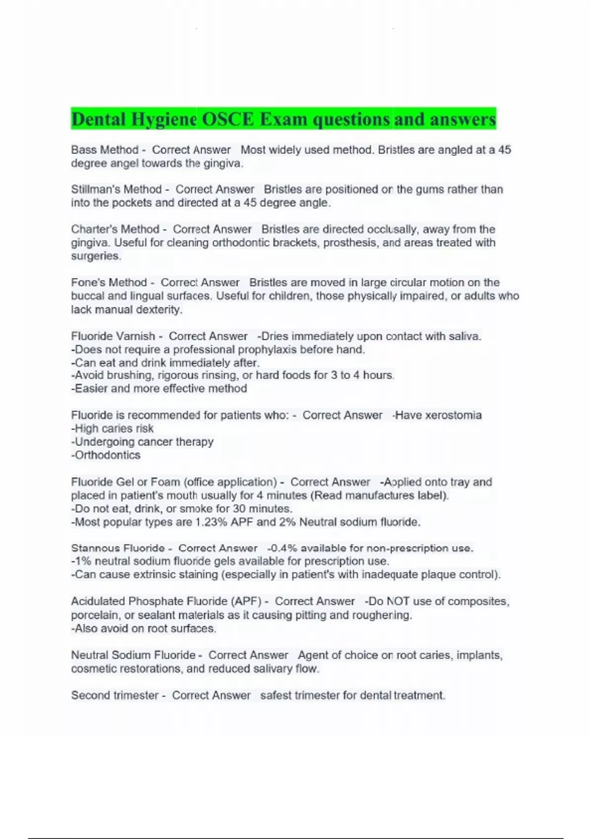 Dental Hygiene OSCE Exam questions and answers Bass Method - Correct Answer Most widely used method. Bristles are angled at a 45 degree angel towards the gingiva. Stillman's Method - Correct Answer Bristles are positioned on the gums rather than into the pockets and directed at a 45 degree angle. Charter's Method - Correct Answer Bristles are directed occlusally, away from the gingiva. Useful for cleaning orthodontic brackets, prosthesis, and areas treated with surgeries. Fone's Method - Correct Answer Bristles are moved in large circular motion on the buccal and lingual surfaces. Useful for children, those physically impaired, or adults who lack manual dexterity. Fluoride Varnish - Correct Answer -Dries immediately upon contact with saliva. -Does not require a professional prophylaxis before hand. -Can eat and drink immediately after. -Avoid brushing, rigorous rinsing, or hard foods for 3 to 4 hours. -Easier and more effective method Fluoride is recommended for patients who: - Correct Answer -Have xerostomia -High caries risk -Undergoing cancer therapy -Orthodontics Fluoride Gel or Foam (office application) - Correct Answer -Applied onto tray and placed in patient's mouth usually for 4 minutes (Read manufactures label). -Do not eat, drink, or smoke for 30 minutes. -Most popular types are 1.23% APF and 2% Neutral sodium fluoride. Stannous Fluoride - Correct Answer -0.4% available for non-prescription use. -1% neutral sodium fluoride gels available for prescription use. -Can cause extrinsic staining (especially in patient's with inadequate plaque control). Acidulated Phosphate Fluoride (APF) - Correct Answer -Do NOT use of composites, porcelain, or sealant materials as it causing pitting and roughening. -Also avoid on root surfaces. Neutral Sodium Fluoride - Correct Answer Agent of choice on root caries, implants, cosmetic restorations, and reduced salivary flow. Second trimester - Correct Answer safest trimester for dental treatment. Bass Method - Correct Answer Most widely used method. Bristles are angled at a 45 degree angel towards the gingiva. Stillman's Method - Correct Answer Bristles are positioned on the gums rather than into the pockets and directed at a 45 degree angle. Charter's Method - Correct Answer Bristles are directed occlusally, away from the gingiva. Useful for cleaning orthodontic brackets, prosthesis, and areas treated with surgeries. Fone's Method - Correct Answer Bristles are moved in large circular motion on the buccal and lingual surfaces. Useful for children, those physically impaired, or adults who lack manual dexterity. Fluoride Varnish - Correct Answer -Dries immediately upon contact with saliva. -Does not require a professional prophylaxis before hand. -Can eat and drink immediately after. -Avoid brushing, rigorous rinsing, or hard foods for 3 to 4 hours. -Easier and more effective method Fluoride is recommended for patients who: - Correct Answer -Have xerostomia -High caries risk -Undergoing cancer therapy -Orthodontics Fluoride Gel or Foam (office application) - Correct Answer -Applied onto tray and placed in patient's mouth usually for 4 minutes (Read manufactures label). -Do not eat, drink, or smoke for 30 minutes. -Most popular types are 1.23% APF and 2% Neutral sodium fluoride. Stannous Fluoride - Correct Answer -0.4% available for non-prescription use. -1% neutral sodium fluoride gels available for prescription use. -Can cause extrinsic staining (especially in patient's with inadequate plaque control). Acidulated Phosphate Fluoride (APF) - Correct Answer -Do NOT use of composites, porcelain, or sealant materials as it causing pitting and roughening. -Also avoid on root surfaces. Neutral Sodium Fluoride - Correct Answer Agent of choice on root caries, implants, cosmetic restorations, and reduced salivary flow. Second trimester - Correct Answer safest trimester for dental treatment.