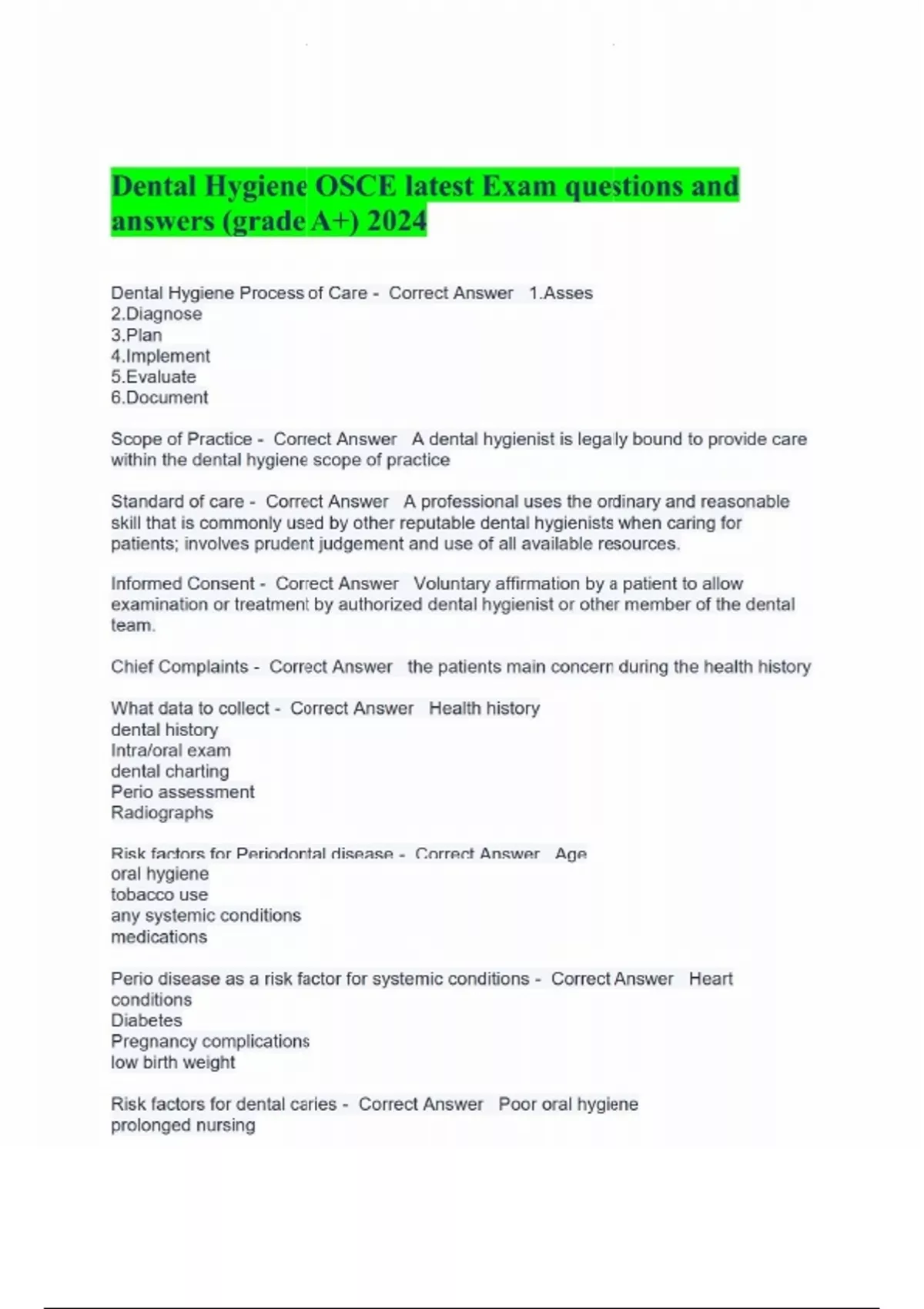 Dental Hygiene OSCE latest Exam questions and answers (grade A+) 2024 Dental Hygiene Process of Care - Correct Answer 1.Asses 2.Diagnose 3.Plan 4.Implement 5.Evaluate 6.Document Scope of Practice - Correct Answer A dental hygienist is legally bound to provide care within the dental hygiene scope of practice Standard of care - Correct Answer A professional uses the ordinary and reasonable skill that is commonly used by other reputable dental hygienists when caring for patients; involves prudent judgement and use of all available resources. Informed Consent - Correct Answer Voluntary affirmation by a patient to allow examination or treatment by authorized dental hygienist or other member of the dental team. Chief Complaints - Correct Answer the patients main concern during the health history What data to collect - Correct Answer Health history dental history Intra/oral exam dental charting Perio assessment Radiographs Risk factors for Periodontal disease - Correct Answer Age oral hygiene tobacco use any systemic conditions medications Perio disease as a risk factor for systemic conditions - Correct Answer Heart conditions Diabetes Pregnancy complications low birth weight Risk factors for dental caries - Correct Answer Poor oral hygiene prolonged nursing