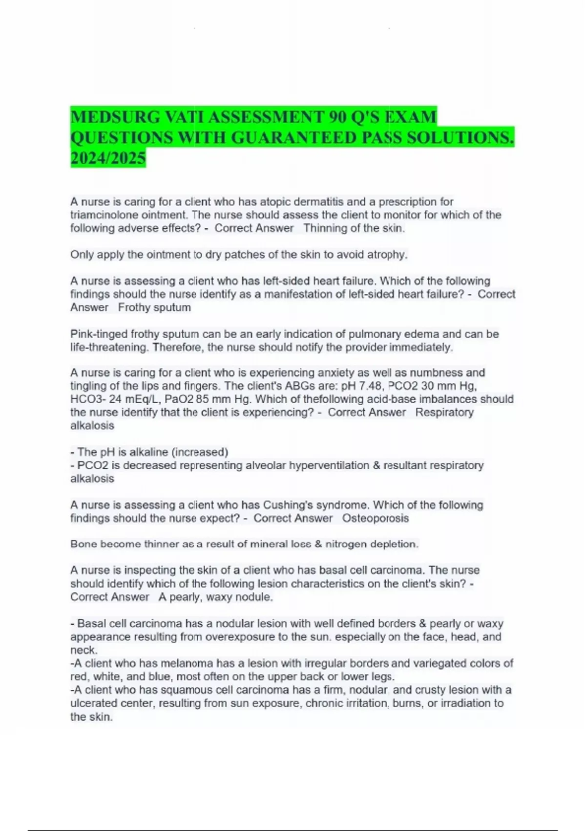 MEDSURG VATI ASSESSMENT 90 Q'S EXAM QUESTIONS WITH GUARANTEED PASS SOLUTIONS. 2024/2025 A nurse is caring for a client who has atopic dermatitis and a prescription for triamcinolone ointment. The nurse should assess the client to monitor for which of the following adverse effects? - Correct Answer Thinning of the skin. Only apply the ointment to dry patches of the skin to avoid atrophy. A nurse is assessing a client who has left-sided heart failure. Which of the following findings should the nurse identify as a manifestation of left-sided heart failure? - Correct Answer Frothy sputum Pink-tinged frothy sputum can be an early indication of pulmonary edema and can be life-threatening. Therefore, the nurse should notify the provider immediately. A nurse is caring for a client who is experiencing anxiety as well as numbness and tingling of the lips and fingers. The client's ABGs are: pH 7.48, PCO2 30 mm Hg, HCO3- 24 mEq/L, PaO2 85 mm Hg. Which of thefollowing acid-base imbalances should the nurse identify that the client is experiencing? - Correct Answer Respiratory alkalosis - The pH is alkaline (increased) - PCO2 is decreased representing alveolar hyperventilation & resultant respiratory alkalosis A nurse is assessing a client who has Cushing's syndrome. Which of the following findings should the nurse expect? - Correct Answer Osteoporosis Bone become thinner as a result of mineral loss & nitrogen depletion. A nurse is inspecting the skin of a client who has basal cell carcinoma. The nurse