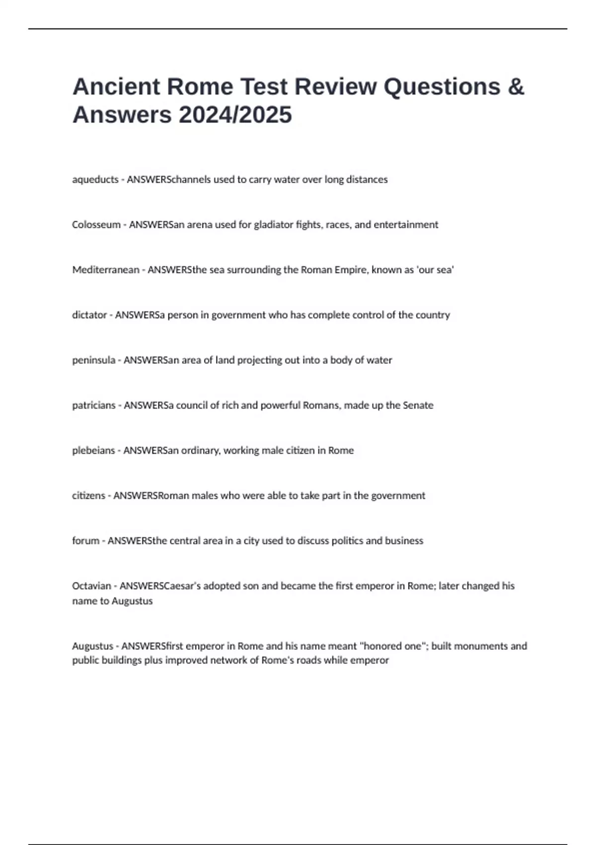 Ancient Rome Test Review Questions & Answers 2024/2025