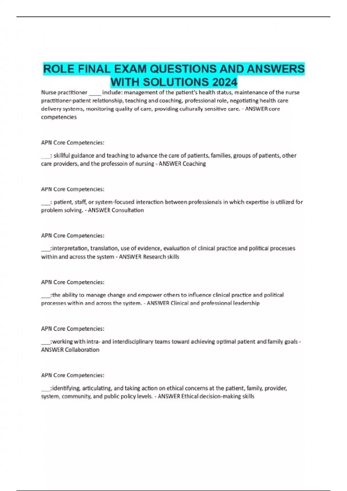 ROLE FINAL EXAM QUESTIONS AND ANSWERS WITH SOLUTIONS 2024 Nurse practitioner ____ include: management of the patient's health status, maintenance of the nurse practitioner-patient relationship, teaching and coaching, professional role, negotiating health care delivery systems, monitoring quality of care, providing culturally sensitive care. - ANSWER core competencies APN Core Competencies: ___: skillful guidance and teaching to advance the care of patients, families, groups of patients, other care providers, and the professoin of nursing - ANSWER Coaching APN Core Competencies: ___: patient, staff, or system-focused interaction between professionals in which expertise is utilized for problem solving. - ANSWER Consultation APN Core Competencies: ___:interpretation, translation, use of evidence, evaluation of clinical practice and political processes within and across the system - ANSWER Research skills APN Core Competencies: ___:the ability to manage change and empower others to influence clinical practice and political processes within and across the system. - ANSWER Clinical and professional leadership APN Core Competencies: ___:working with intra- and interdisciplinary teams toward achieving optimal patient and family goals - ANSWER Collaboration APN Core Competencies: ___:identifying, articulating, and taking action on ethical concerns at the patient, family, provider, system, community, and public policy levels. - ANSWER Ethical decision-making skills