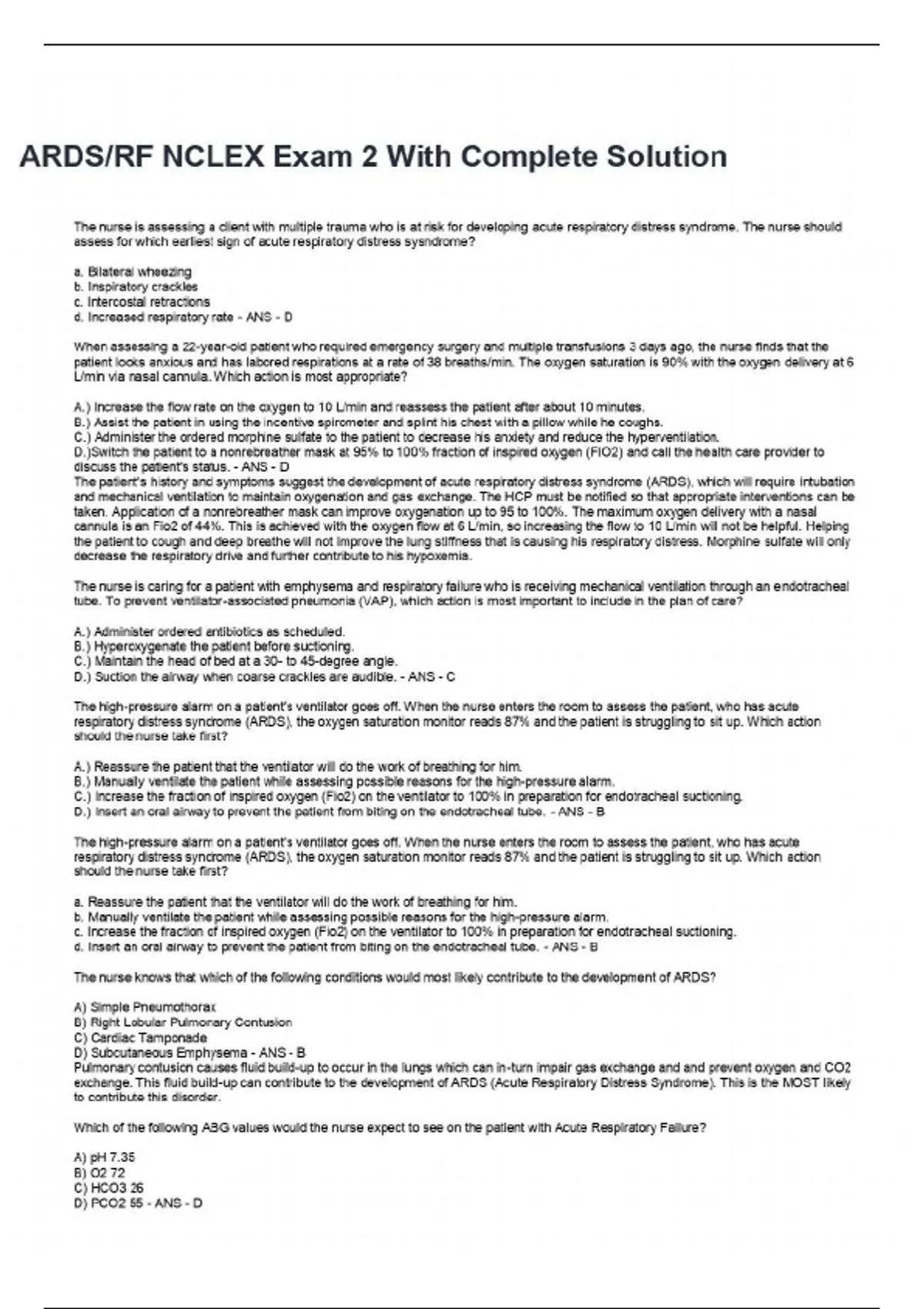 ARDS/RF NCLEX Exam 2 With Complete Solution