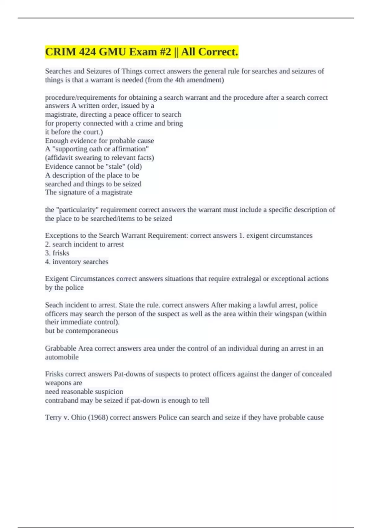 Exceptions to the Search Warrant Requirement: correct answers 1. exigent circumstances
