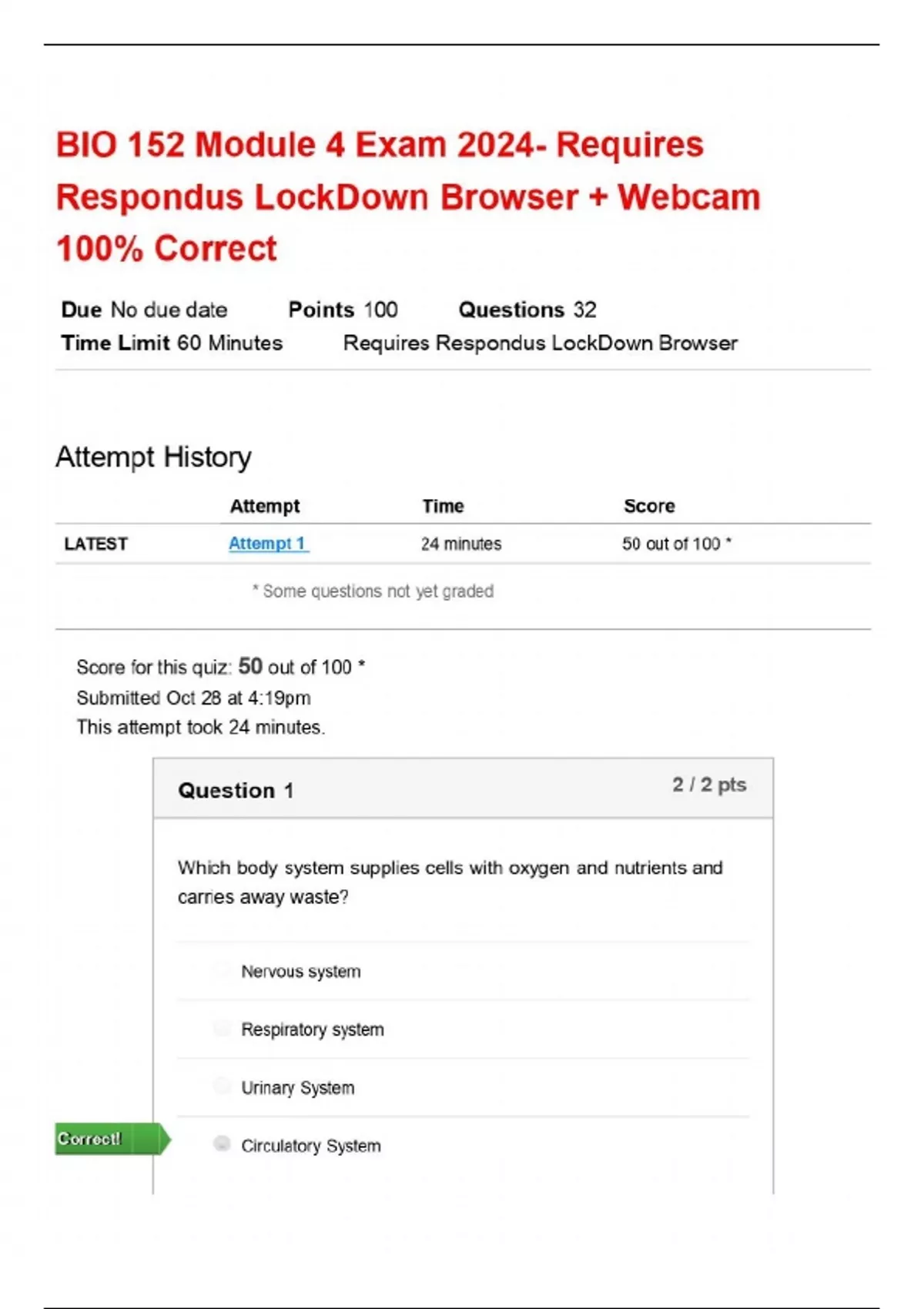 BIO 152 Module 4 Exam 2024- Requires Respondus LockDown Browser + Webcam 100% Correct BIO 152 Module 4 Exam 2024- Requires Respondus LockDown Browser + Webcam