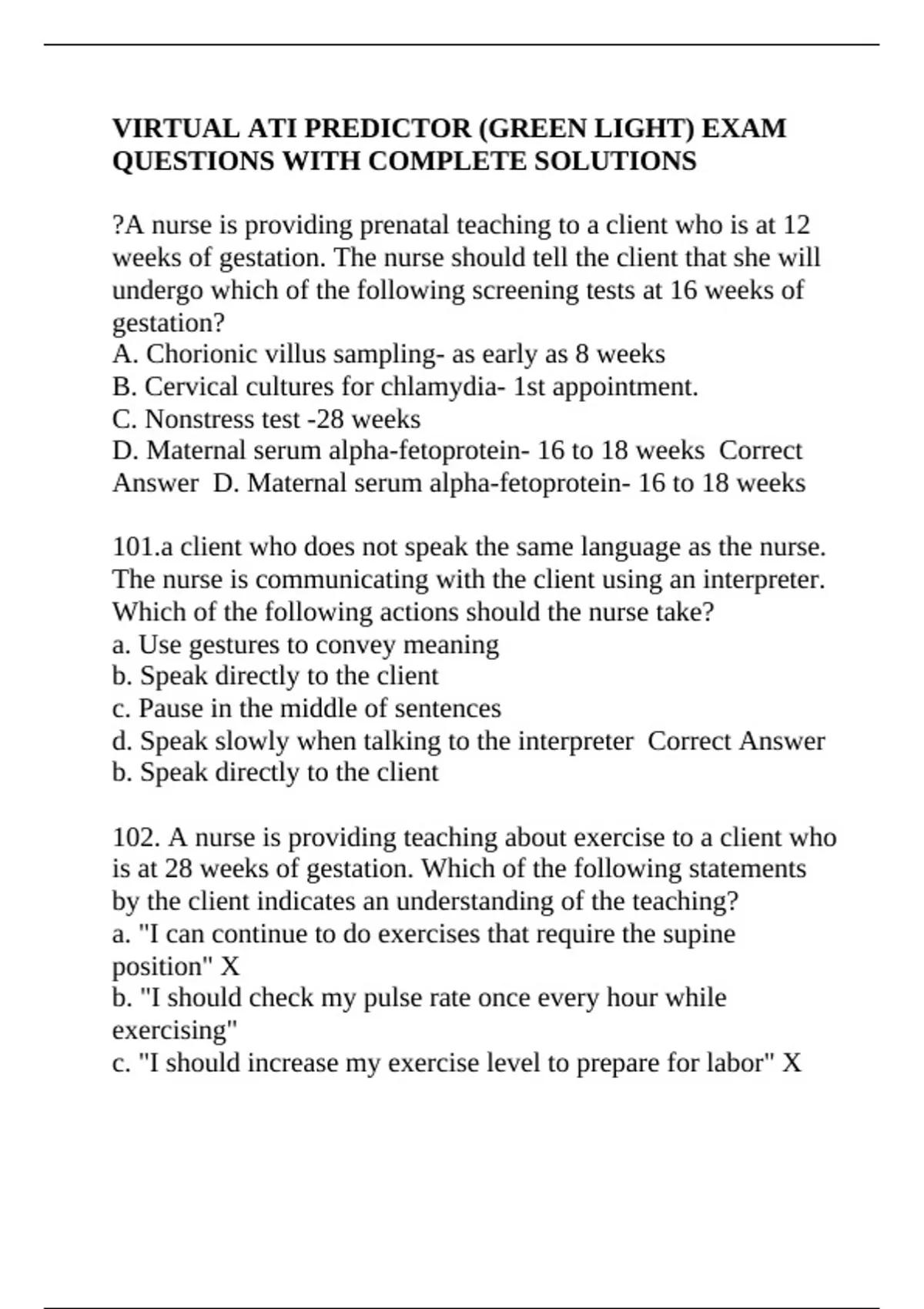 VIRTUAL ATI PREDICTOR (GREEN LIGHT) EXAM QUESTIONS WITH COMPLETE SOLUTIONS