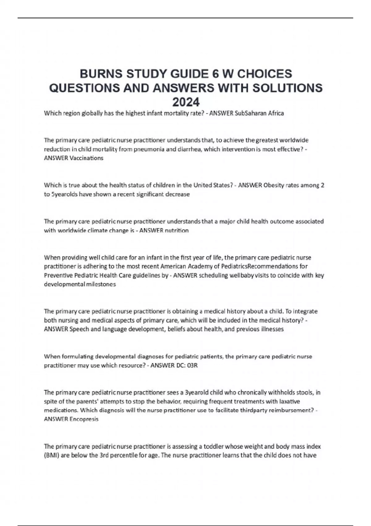 BURNS STUDY GUIDE 6 W CHOICES QUESTIONS AND ANSWERS WITH SOLUTIONS 2024 Which region globally has the highest infant mortality rate? - ANSWER SubSaharan Africa The primary care pediatric nurse practitioner understands that, to achieve the greatest worldwide reduction in child mortality from pneumonia and diarrhea, which intervention is most effective? - ANSWER Vaccinations Which is true about the health status of children in the United States? - ANSWER Obesity rates among 2 to 5yearolds have shown a recent significant decrease The primary care pediatric nurse practitioner understands that a major child health outcome associated with worldwide climate change is - ANSWER nutrition When providing well child care for an infant in the first year of life, the primary care pediatric nurse practitioner is adhering to the most recent American Academy of PediatricsRecommendations for Preventive Pediatric Health Care guidelines by - ANSWER scheduling wellbaby visits to coincide with key developmental milestones The primary care pediatric nurse practitioner is obtaining a medical history about a child. To integrate both nursing and medical aspects of primary care, which will be included in the medical history? - ANSWER Speech and language development, beliefs about health, and previous illnesses When formulating developmental diagnoses for pediatric patients, the primary care pediatric nurse practitioner may use which resource? - ANSWER DC: 03R The primary care pediatric nurse practitioner sees a 3yearold child who chronically withholds stools, in spite of the parents' attempts to stop the behavior, requiring frequent treatments with laxative medications. Which diagnosis will the nurse practitioner use to facilitate thirdparty reimbursement? - ANSWER Encopresis The primary care pediatric nurse practitioner is assessing a toddler whose weight and body mass index (BMI) are below the 3rd percentile for age. The nurse practitioner learns that the child does not have regular mealtimes and is allowed to carry a bottle of juice around at all times. The nurse practitioner plans to work with this family to develop improved meal patterns. Which diagnosis will the nurse practitioner use for this problem? - ANSWER Parenting alteration The primary care pediatric nurse practitioner is performing a well child checkup on a 20monthold child. The child was 4 weeks premature and, according to a parent completed developmental questionnaire, has achieved milestones for a 15monthold infant. Which action is correct? - ANSWER Perform an indepth developmental assessment screen at this visit to evaluate this child The primary care pediatric nurse practitioner performs a developmental assessment on a 3yearold child and notes normal cognitive, finemotor, and grossmotor abilities. The child responds appropriately to verbal commands during the assessment but refuses to speak when asked questions. The parent tells the nurse practitioner that the child talks at home and that most other adults can understand what the child says. The nurse practitioner will - ANSWER continue to evaluate the child's speech at subsequent visits.