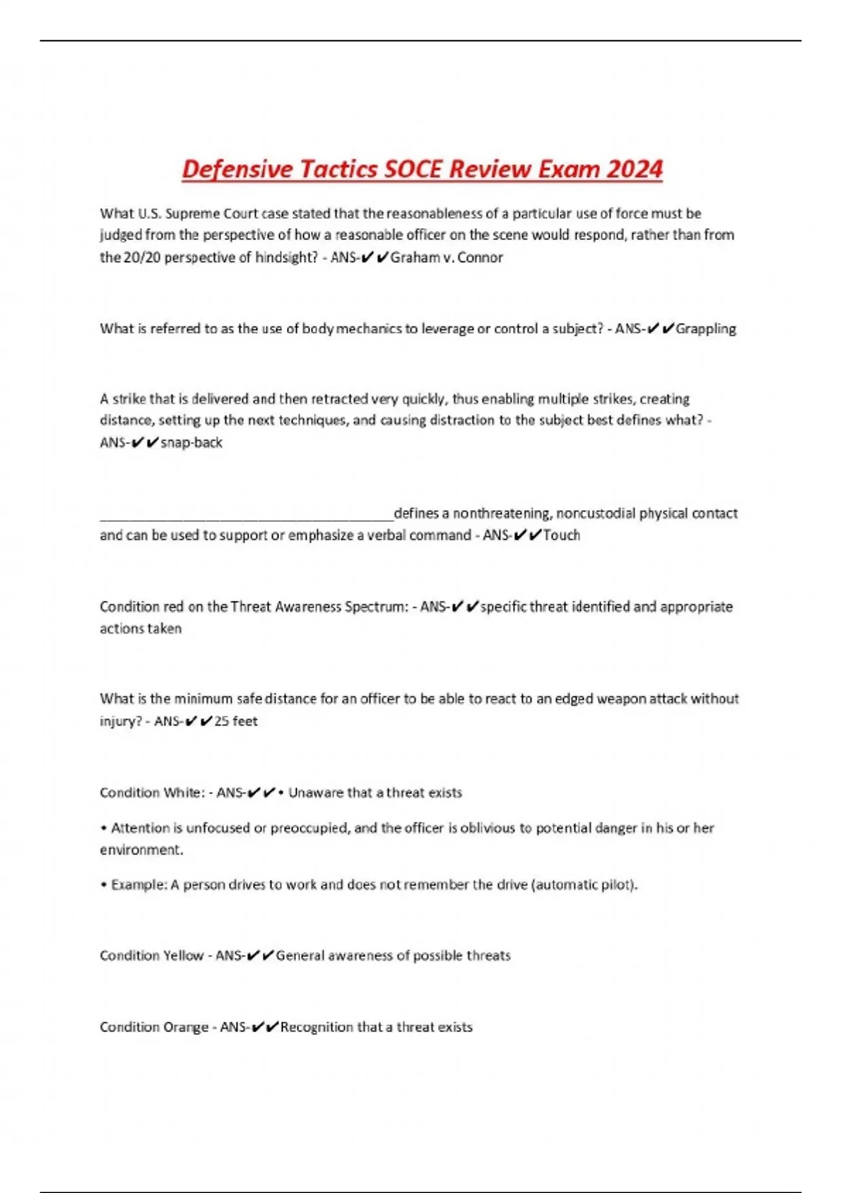 Defensive Tactics SOCE Review Exam 2024 What U.S. Supreme Court case stated that the reasonableness of a particular use of force must be judged from the perspective of how a reasonable officer on the scene would respond, rather than from the 20/20 perspective of hindsight? - ANS-Graham v. Connor What is referred to as the use of body mechanics to leverage or control a subject? - ANS-Grappling A strike that is delivered and then retracted very quickly, thus enabling multiple strikes, creating distance, setting up the next techniques, and causing distraction to the subject best defines what? - ANS-snap-back _______________________________________defines a nonthreatening, noncustodial physical contact and can be used to support or emphasize a verbal command - ANS-Touch Condition red on the Threat Awareness Spectrum: - ANS-specific threat identified and appropriate actions taken What is the minimum safe distance for an officer to be able to react to an edged weapon attack without injury? - ANS-25 feet Condition White: - ANS-• Unaware that a threat exists • Attention is unfocused or preoccupied, and the officer is oblivious to potential danger in his or her environment. • Example: A person drives to work and does not remember the drive (automatic pilot). Condition Yellow - ANS-General awareness of possible threats Condition Orange - ANS-Recognition that a threat exists
