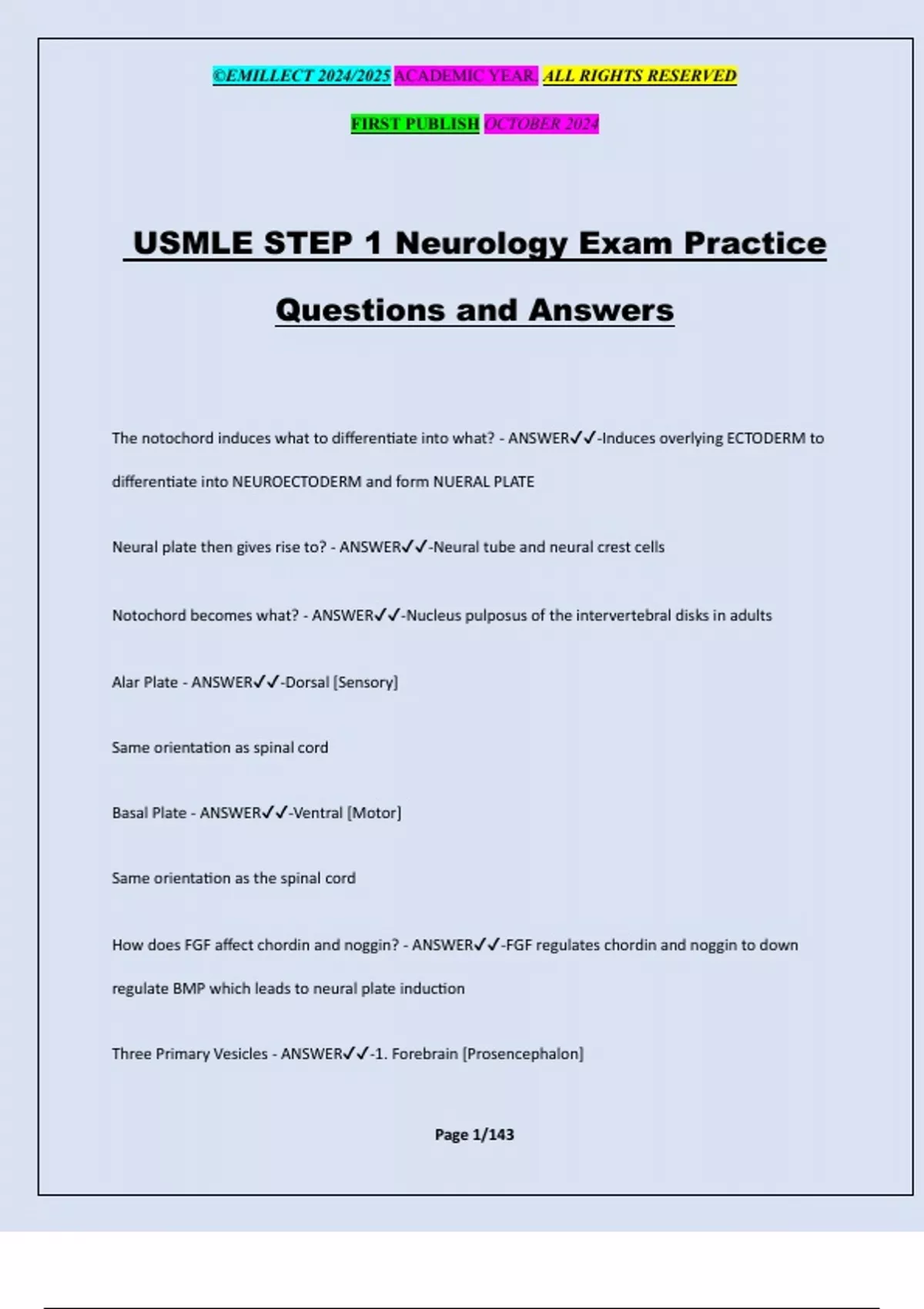 USMLE STEP 1 Neurology Exam Practice Questions and Answers The notochord induces what to differentiate into what? - ANSWER-Induces overlying ECTODERM to differentiate into NEUROECTODERM and form NUERAL PLATE Neural plate then gives rise to? - ANSWER-Neural tube and neural crest cells Notochord becomes what? - ANSWER-Nucleus pulposus of the intervertebral disks in adults Alar Plate - ANSWER-Dorsal [Sensory] Same orientation as spinal cord Basal Plate - ANSWER-Ventral [Motor] Same orientation as the spinal cord How does FGF affect chordin and noggin? - ANSWER-FGF regulates chordin and noggin to down regulate BMP which leads to neural plate induction Three Primary Vesicles - ANSWER-1. Forebrain [Prosencephalon] ©EMILLECT 2024/2025 ACADEMIC YEAR. ALL RIGHTS RESERVED FIRST PUBLISH OCTOBER 2024 Page 2/143 2. Midbrain [Mesencephalon] 3. Hindbrain [Rhombencphaln] The Forebrain gives rise to: - ANSWER-1. Telencephalon [Cerebral hemispheres, lateral ventricles] 2. Diencephalon [Thalamus, Third Ventricle] The Midbrain gives rise to: - ANSWER-1. Mesencephalon [Midbrain, aqueduct] The Hindbrain gives rise to: - ANSWER-1. Metencephalon [Pons, cerebellum, upper part of the fourth ventricle] 2. Myelencephalon [Medulla, Lower part of the fourth ventricle] CNS/PNS Origins - ANSWER-Neuroectoderm = CNS neurons, ependymal cell [Inner lining of ventricles, makes CSF], oligodendrocytes, astrocytes Neural crest cells = PNS, schwann cells Mesoderm = Microglia [Like Macrophages, originate from Mesoderm] Neural tube defects - ANSWER-NEUROPORES fail to fuse [4th week] → Persistent connection between amniotic cavity and spinal canal Associated with: ©EMILLECT 2024/2025 ACADEMIC YEAR. ALL RIGHTS RESERVED FIRST PUBLISH OCTOBER 2024 Page 3/143 1. Low folate levels before conception and during pregnancy 2. ↑ a-fetoprotein levels [AFP] in amniotic and maternal serum 3. ↑ AChE in amniotic fluid [Helpful confirmatory test] -- Fetal AChe in CSF transudates across defect into amniotic fluid Spina bifida occulta - ANSWER-Failure of bony spinal canal to close, NO STRUCTURAL HERNIATION Usually seen at lower vertebral levels DURA INTACT Associated w/ tuft of hair or skin dimple at level of bony defect NORMAL AFP Meningocele - ANSWER-Meninges [BUT NO NEURAL TISSUES] herniates through bony defect Meningomyelocele - ANSWER-Meninges and neural tissue herniate through bony defect Associated w/ Arnold-Chiari Type II Malformation Anencephaly - ANSWER-Malformation of the ANTERIOR NEURAL TUBE → 1. No forebrain ©EMILLECT 2024/2025 ACADEMIC YEAR. ALL RIGHTS RESERVED FIRST PUBLISH OCTOBER 2024 Page 4/143 2. Open calvarium Clinical Findings: 1. ↑ a-fetoprotein levels [AFP] 2. Polyhydramnios [No swallowing center in brain] 3. Associated w/ MATERNAL TYPE I DIABETES 4. Maternal folate supplementation ↓ risk Holoprosencephaly - ANSWER-Failure of LEFT AND RIGHT HEMISPHERES TO SEPARATE Usually occurs during the 5th and 6th week May be related to mutations in the SONIC HEDGEHOG signa
