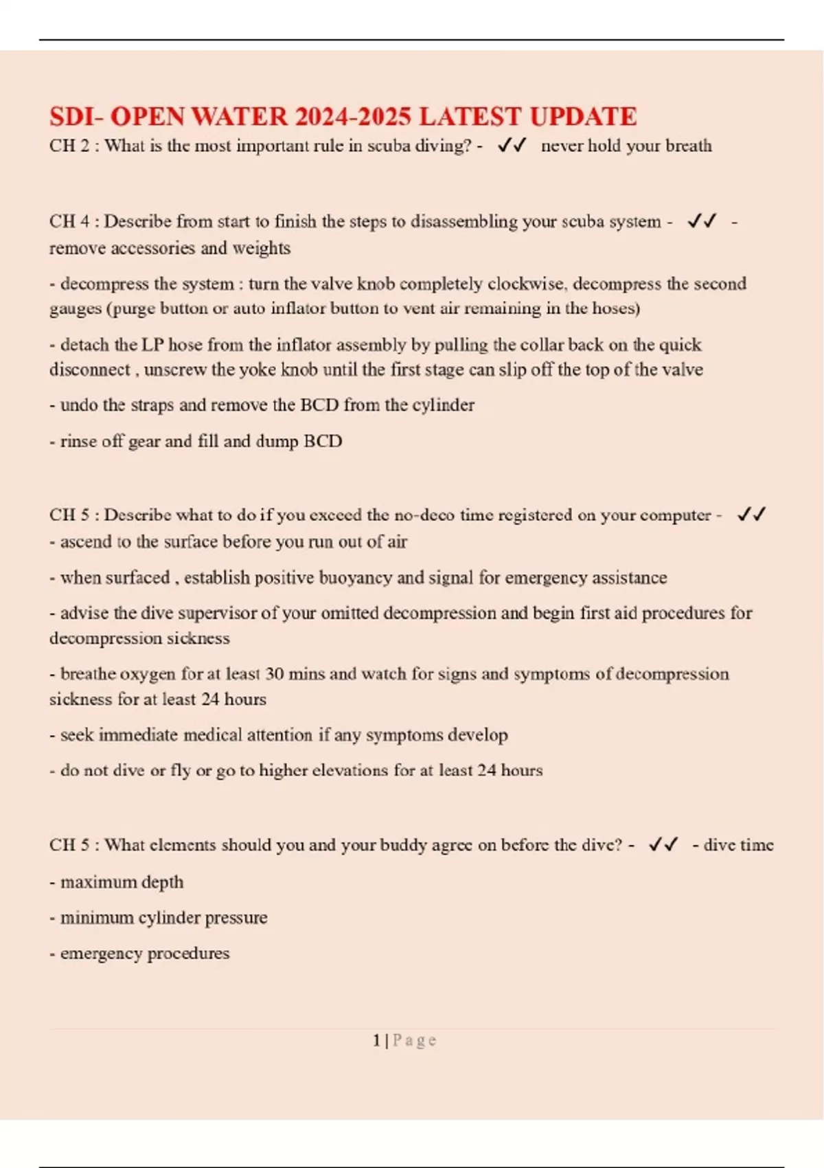 SDI- OPEN WATER LATEST UPDATE CH 2 : What is the most important rule in scuba diving? - never hold your breath CH 4 : Describe from start to finish the steps to disassembling your scuba system - - remove accessories and weights - decompress the system : turn the valve knob completely clockwise, decompress the second gauges (purge button or auto inflator button to vent air remaining in the hoses) - detach the LP hose from the inflator assembly by pulling the collar back on the quick disconnect , unscrew the yoke knob until the first stage can slip off the top of the valve - undo the straps and remove the BCD from the cylinder - rinse off gear and fill and dump BCD CH 5 : Describe what to do if you exceed the no-deco time registered on your computer - - ascend to the surface before you run out of air - when surfaced , establish positive buoyancy and signal for emergency assistance - advise the dive supervisor of your omitted decompression and begin first aid procedures for decompression sickness - breathe oxygen for at least 30 mins and watch for signs and symptoms of decompression sickness for at least 24 hours - seek immediate medical attention if any symptoms develop - do not dive or fly or go to higher elevations for at least 24 hours CH 5 : What elements should you and your buddy agree on before the dive? - - dive time - maximum depth - minimum cylinder pressure - emergency procedures CH 5 : Define risk management - - a means of preventing problems and planning a response to any emergency that arises - involves planning ahead , employing good diving practices and knowing what to do before an emergency CH 5 : Why should you avoid consuming drugs or alcohol prior to a dive? - it greatly increases the risk of decompression sickness in divers CH 5 : What is the emergency procedure for suspected decompression sickness? - 1: move the afflicted diver out of danger 2: activate the Emergency Medial System (EMS) 3: monitor life support signs (pulse and respiration) and provide CPR if necessary 4: provide 100% oxygen via demand regulator if the diver is breathing 5: evacuation if necessary CH 5 : What should you do if you become entangled underwater? - - relax, do not struggle to free yourself , moving around results in further entanglement - figure out how to untangle carefully or carefully use knife to cut the line away, cut away from body and gear CH 5 : Describe the procedure recommended for a safety stop - - Should be conducted between 3 and 6 meters (10 and 20 feet) for three to five minutes before coming up to the surface - a safety stop is recommended on any dive up to 30 meters (100 feet) - for dives over 30 meters (100 feet), a saftey stop is mandatory