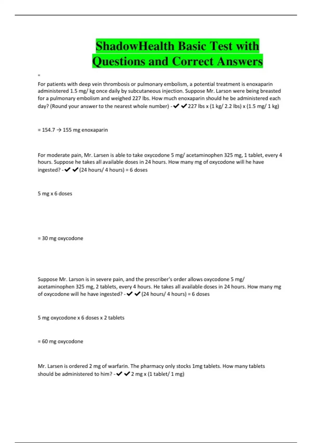 ShadowHealth Basic Test with Questions and Correct Answers