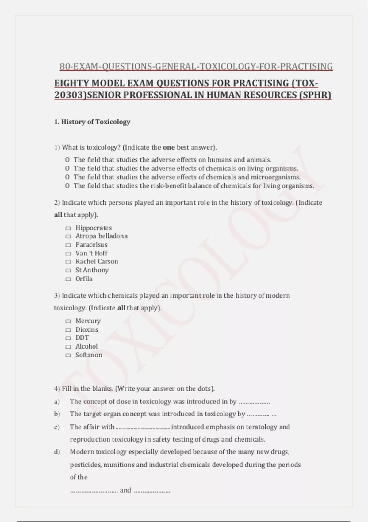 EIGHTY MODEL EXAM QUESTIONS FOR PRACTISING (TOX-