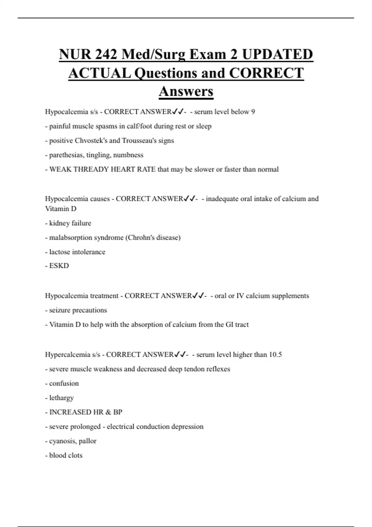 NUR 242 Med/Surg Exam 2 UPDATED ACTUAL Questions and CORRECT Answers Hypocalcemia s/s - CORRECT ANSWER- - serum level below 9 - painful muscle spasms in calf/foot during rest or sleep - positive Chvostek's and Trousseau's signs - parethesias, tingling, numbness - WEAK THREADY HEART RATE that may be slower or faster than normal Hypocalcemia causes - CORRECT ANSWER- - inadequate oral intake of calcium and Vitamin D