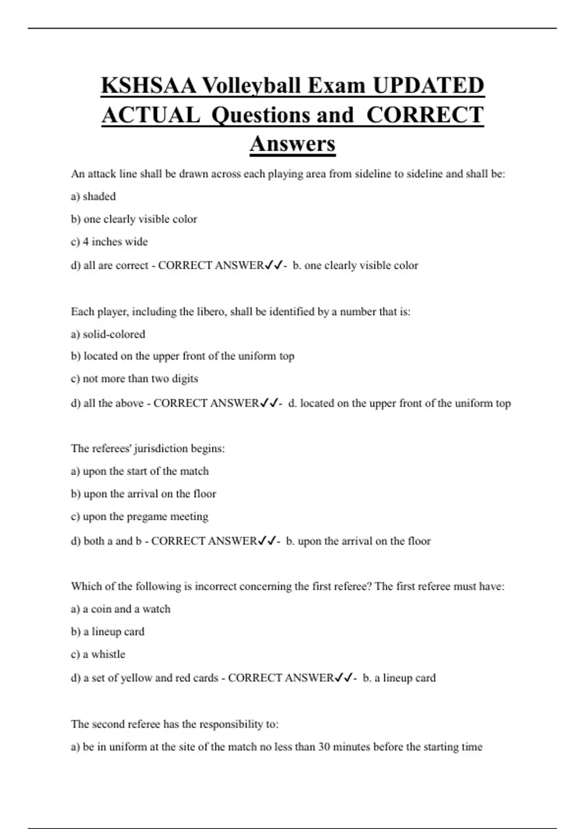 KSHSAA Volleyball Exam UPDATED ACTUAL Questions and CORRECT Answers An attack line shall be drawn across each playing area from sideline to sideline and shall be: a) shaded b) one clearly visible color c) 4 inches wide d) all are correct - CORRECT ANSWER- b. one clearly visible color Each player, including the libero, shall be identified by a number that is: