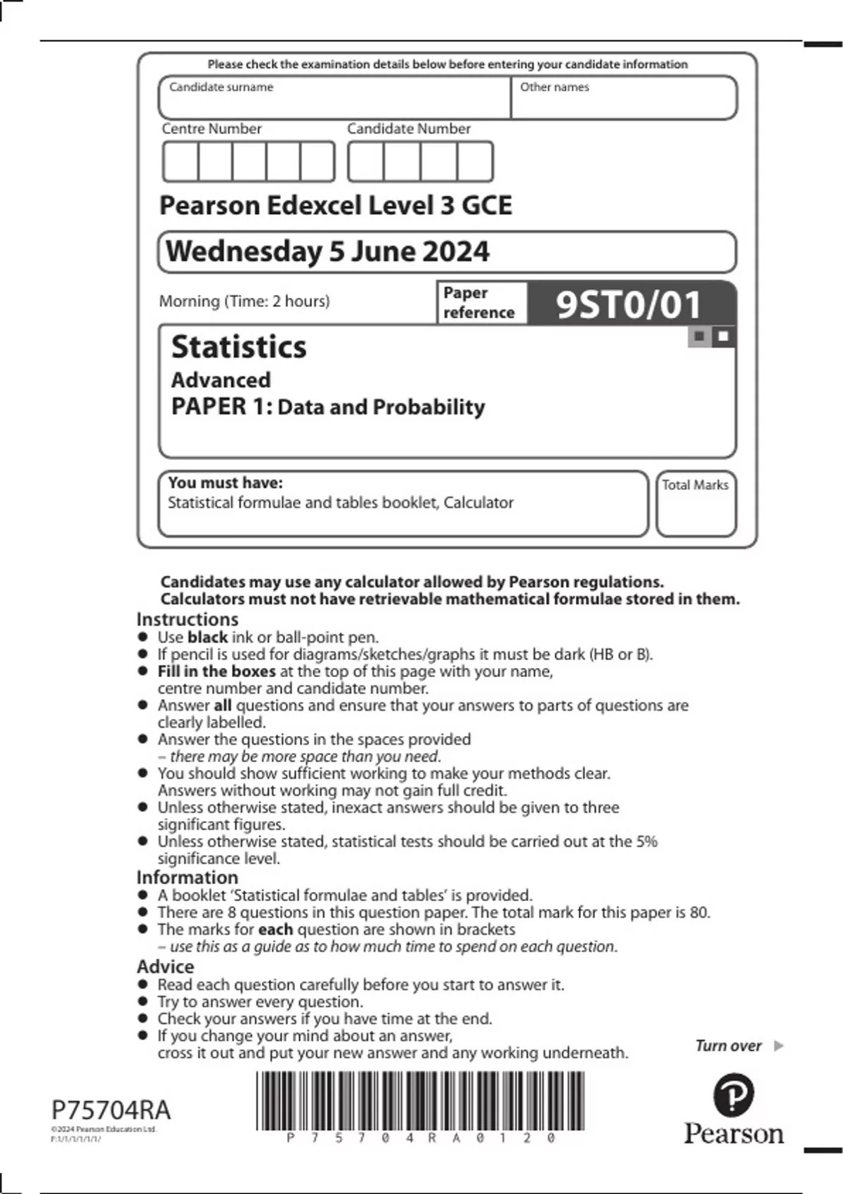 EDEXCEL statistics 9st0-01 paper 1: data and probability question-paper june 2024