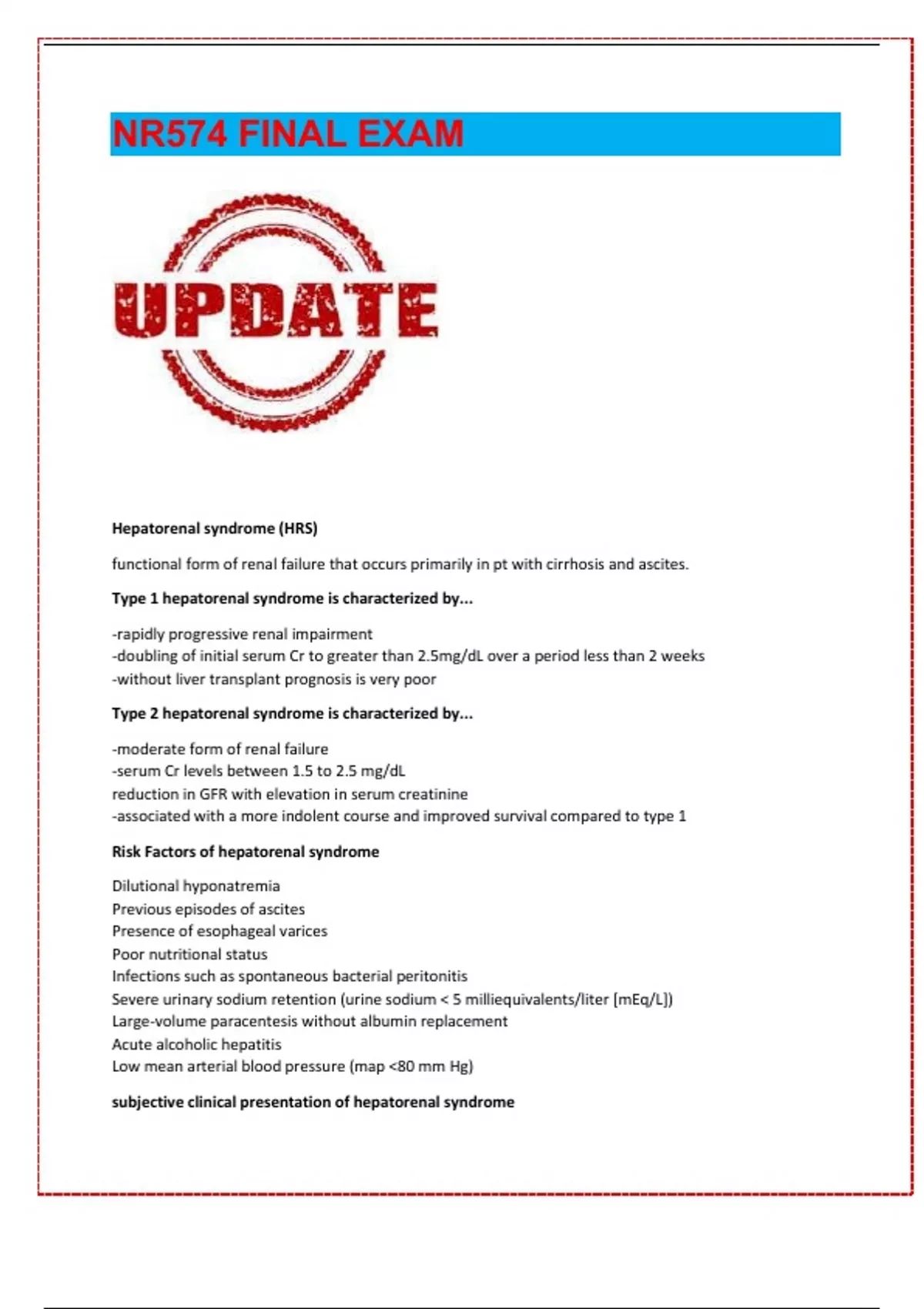 Hepatorenal syndrome (HRS) functional form of renal failure that occurs primarily in pt with cirrhosis and ascites. Type 1 hepatorenal syndrome is characterized by... -rapidly progressive renal impairment -doubling of initial serum Cr to greater than 2.5mg/dL over a period less than 2 weeks -without liver transplant prognosis is very poor Type 2 hepatorenal syndrome is characterized by... -moderate form of renal failure -serum Cr levels between 1.5 to 2.5 mg/dL reduction in GFR with elevation in serum creatinine -associated with a more indolent course and improved survival compared to type 1 Risk Factors of hepatorenal syndrome Dilutional hyponatremia Previous episodes of ascites Presence of esophageal varices Poor nutritional status Infections such as spontaneous bacterial peritonitis Severe urinary sodium retention (urine sodium 5 milliequivalents/liter [mEq/L]) Large-volume paracentesis without albumin replacement Acute alcoholic hepatitis Low mean arterial blood pressure (map 80 mm Hg)