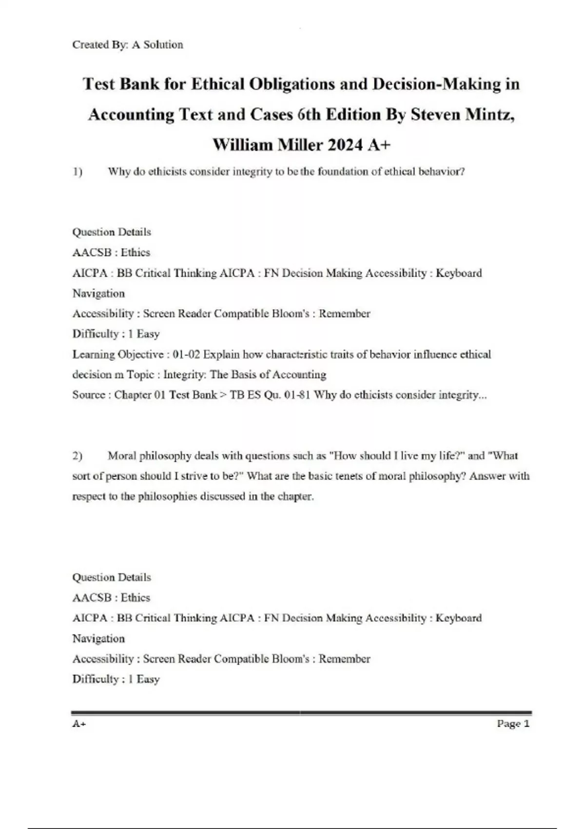 Test Bank Ethical Obligations and Decision-Making in Accounting Text and Cases 6th Edition By Steven Mintz, William Miller|Chapter 1-8 Chapter 1: Ethical Reasoning: Implications for Accounting Chapter 2: Cognitive Processes and Ethical Decision Making in Accounting Chapter 3: Organizational Ethics and Corporate Governance Chapter 4: AICPA Code of Professional Conduct Chapter 5: Fraud in Financial Statements and Auditor Responsibilities Chapter 6: Motivation for Fraudulent Financial Reporting Chapter 7: Consequences of Earnings Management: The Need for Ethical Leadership in Accounting Chapter 8: Auditors’ Legal Liabilities and Defenses