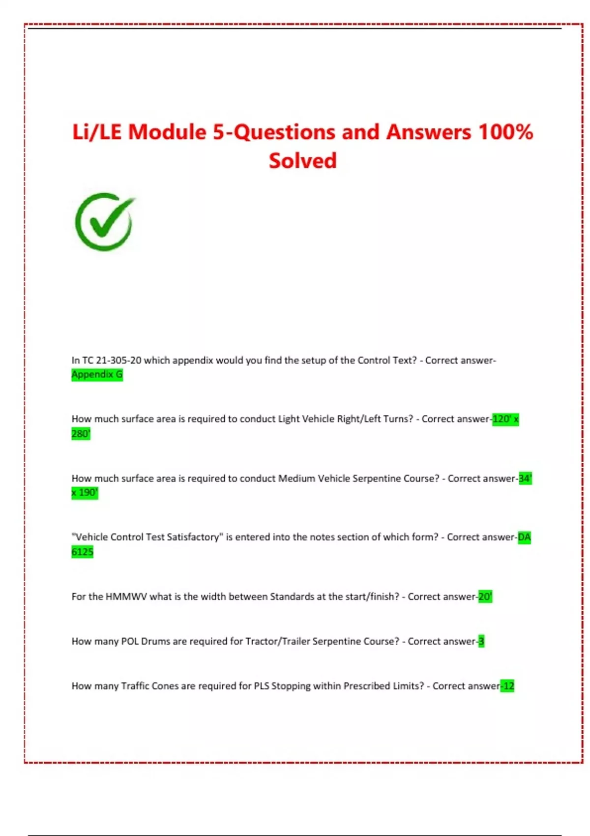 In TC 21-305-20 which appendix would you find the setup of the Control Text? - Correct answer-Appendix G How much surface area is required to conduct Light Vehicle Right/Left Turns? - Correct answer-120' x 280' How much surface area is required to conduct Medium Vehicle Serpentine Course? - Correct answer-34' x 190' "Vehicle Control Test Satisfactory" is entered into the notes section of which form? - Correct answer-DA 6125 For the HMMWV what is the width between Standards at the start/finish? - Correct answer-20' How many POL Drums are required for Tractor/Trailer Serpentine Course? - Correct answer-3 How many Traffic Cones are required for PLS Stopping within Prescribed Limits? - Correct answer-12