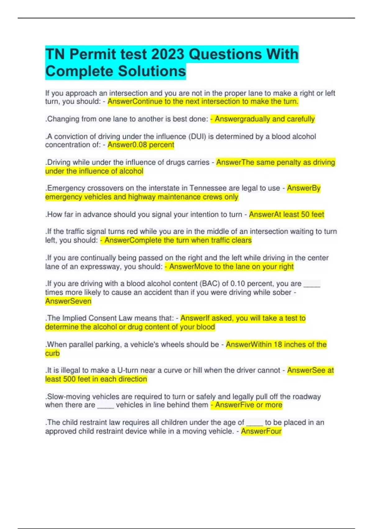 TN Permit test 2023 Questions With Complete Solutions If you approach an intersection and you are not in the proper lane to make a right or left turn, you should: - AnswerContinue to the next intersection to make the turn. .Changing from one lane to another is best done: - Answergradually and carefully .A conviction of driving under the influence (DUI) is determined by a blood alcohol concentration of: - Answer0.08 percent .Driving while under the influence of drugs carries - AnswerThe same penalty as driving under the influence of alcohol .Emergency crossovers on the interstate in Tennessee are legal to use - AnswerBy emergency vehicles and highway maintenance crews only .How far in advance should you signal your intention to turn - AnswerAt least 50 feet .If the traffic signal turns red while you are in the middle of an intersection waiting to turn left, you should: - AnswerComplete the turn when traffic clears .If you are continually being passed on the right and the left while driving in the center lane of an expressway, you should: - AnswerMove to the lane on your right .If you are driving with a blood alcohol content (BAC) of 0.10 percent, you are ____ times more likely to cause an accident than if you were driving while sober - AnswerSeven .The Implied Consent Law means that: - AnswerIf asked, you will take a test to determine the alcohol or drug content of your blood .When parallel parking, a vehicle's wheels should be - AnswerWithin 18 inches of the curb .It is illegal to make a U-turn near a curve or hill when the driver cannot - AnswerSee at least 500 feet in each direction .Slow-moving vehicles are required to turn or safely and legally pull off the roadway when there are ____ vehicles in line behind them - AnswerFive or more .The child restraint law requires all children under the age of ____ to be placed in an approved child restraint device while in a moving vehicle. - AnswerFour .In a vehicle equipped with airbags, the safest place for children age 12 and under to ride is in - AnswerThe back seat. .Unless otherwise posted, the speed limit on primary and secondary state and federal highways is - Answer55 mph .When adjusting the driver's seat for good driving posture, set the seat in an upright position with your body about how far from the steering wheel? - Answer10 to 12 inches .Tailgating other drivers (driving too closely to their rear bumper) - AnswerCan frustrate other drivers and make them angry .Driving under the influence of any medication which impairs your driving is permitted - AnswerUnder no circumstances .A solid yellow line next to a broken yellow line means that vehicles - AnswerNext to the broken line may pass .You want to park uphill on a two-way road and there is no curb. Which direction do you turn your front wheels - AnswerRight, toward the side of the road .You are involved in a minor collision at an intersection. There are no injuries and there is very little vehicle damage. You should: - AnswerMove your vehicle out of the traffic lane, if possible .If there is no crosswalk and you see a pedestrian crossing your lane, you should - AnswerStop and let the pedestrian finish crossing .You are driving on the freeway behind a large truck. You should drive - AnswerFarther behind the truck than you would if following a passenger vehicle .You must yield to a pedestrian using a white cane or guide dog - AnswerAt all times .To see vehicles in your blind spots, you should check - AnswerOver your shoulders .You are on the freeway and traffic is merging into your lane. You should - AnswerMake room for the merging traffic, if possible .Extra space in front of a large truck is needed for - AnswerThe truck driver to stop the vehicle .When passing another vehicle, it is safe to return to your lane if you - AnswerSee the vehicle's headlights in your rearview mirror .If you see orange construction signs and cones on a freeway, you must - AnswerBe prepared for workers and equipment ahead