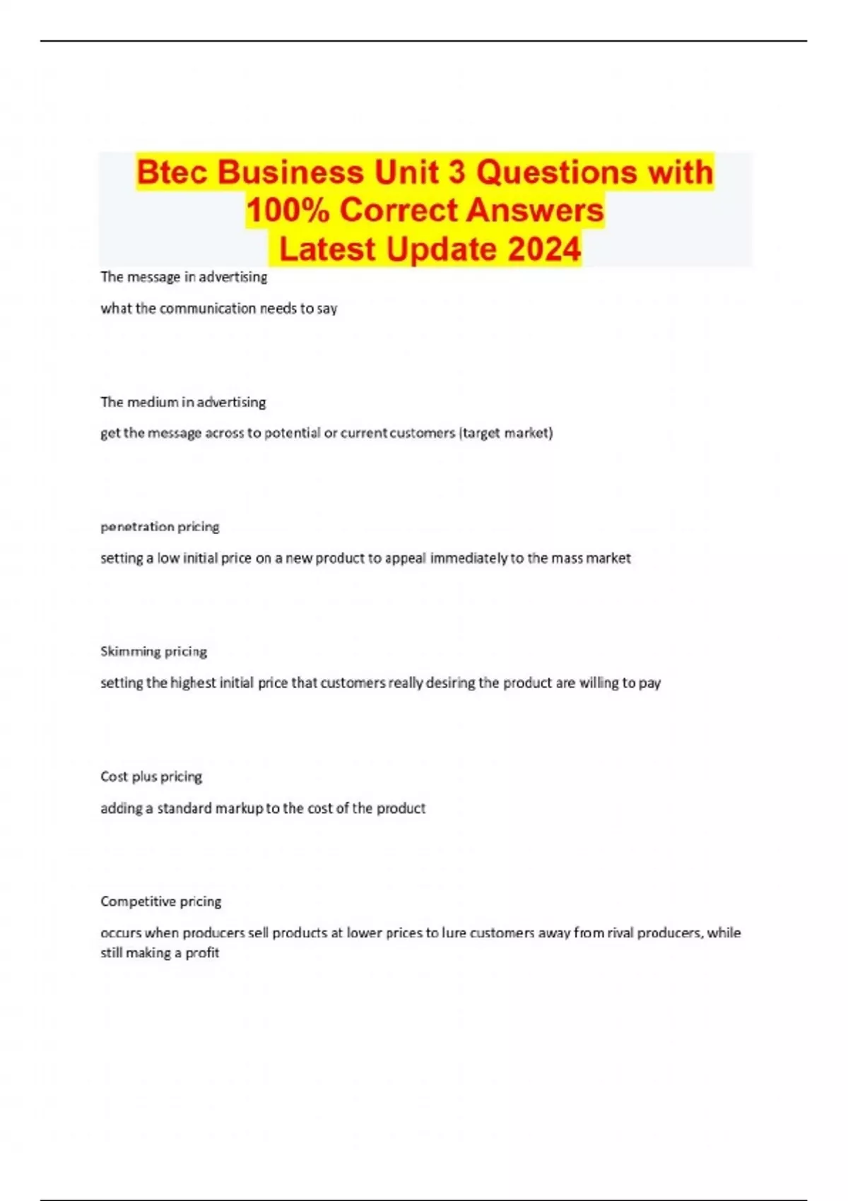 Btec Business Unit 3 Questions with 100% Correct Answers Latest Update 2024