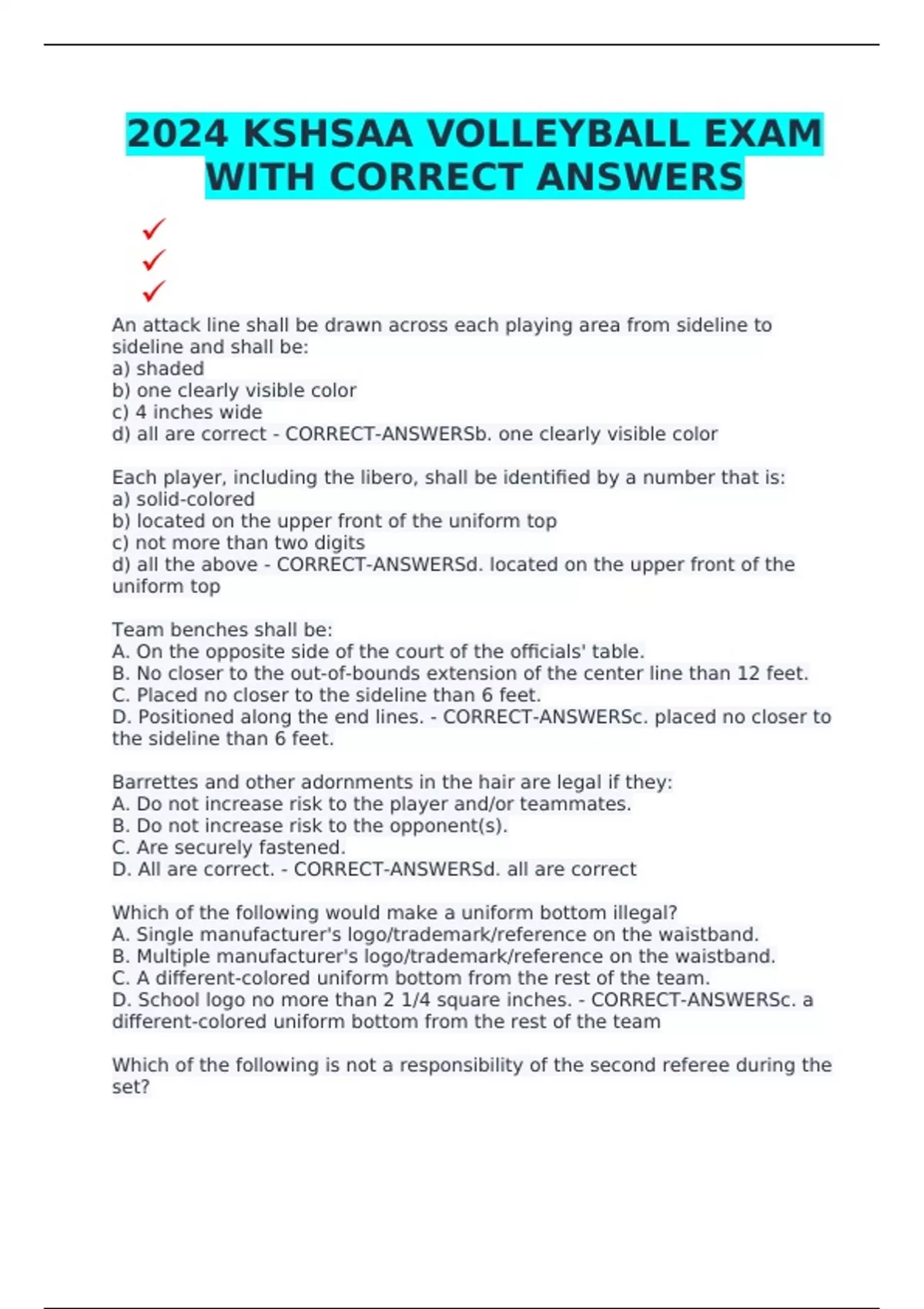 2024 KSHSAA VOLLEYBALL EXAM WITH CORRECT ANSWERS