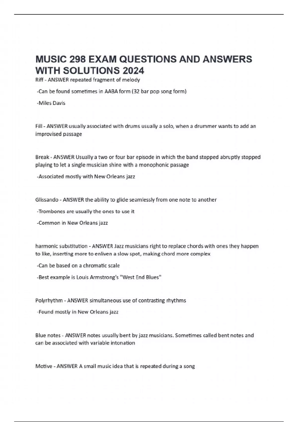 MUSIC 298 EXAM QUESTIONS AND ANSWERS WITH SOLUTIONS 2024