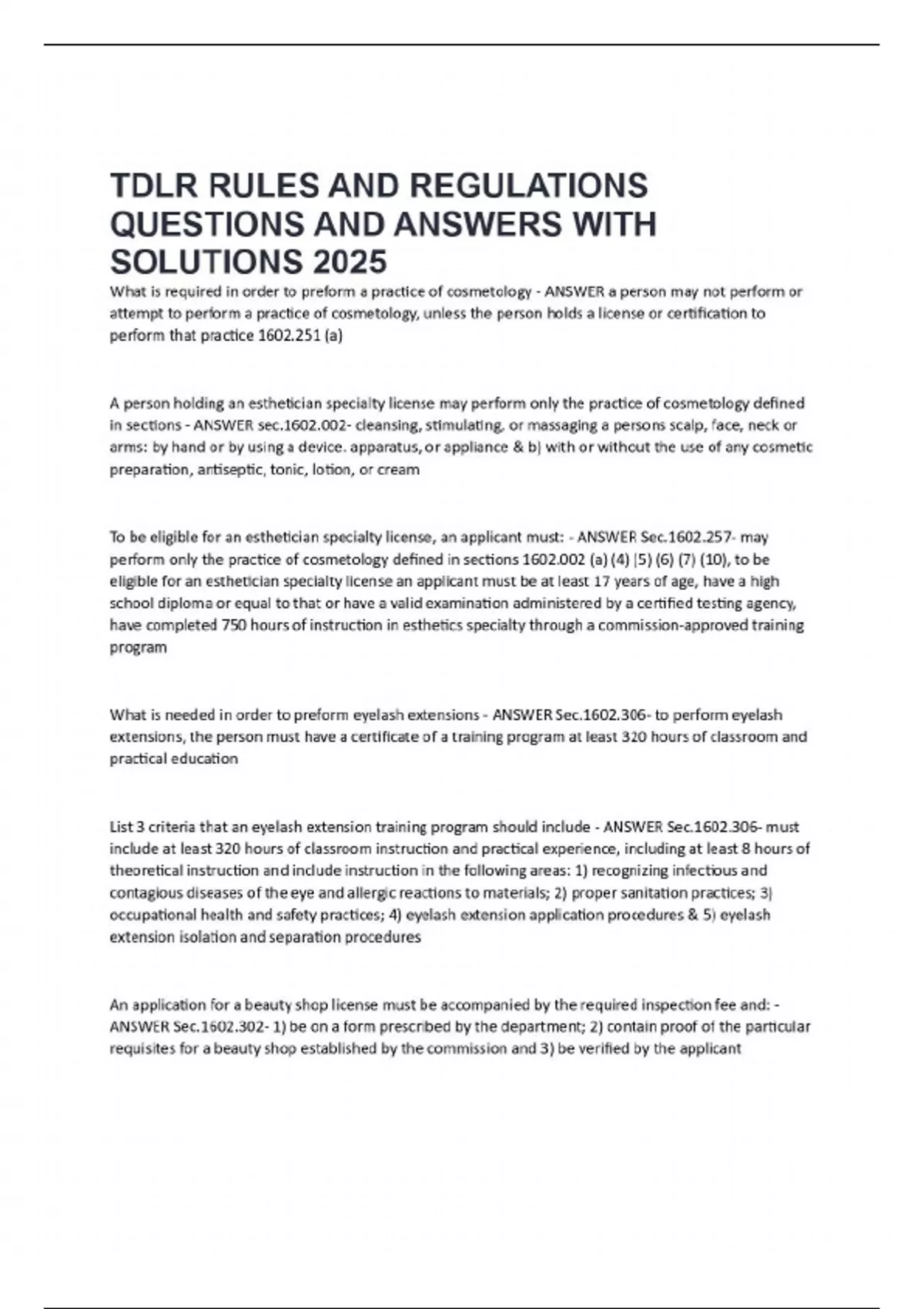 TDLR RULES AND REGULATIONS QUESTIONS AND ANSWERS WITH SOLUTIONS 2025