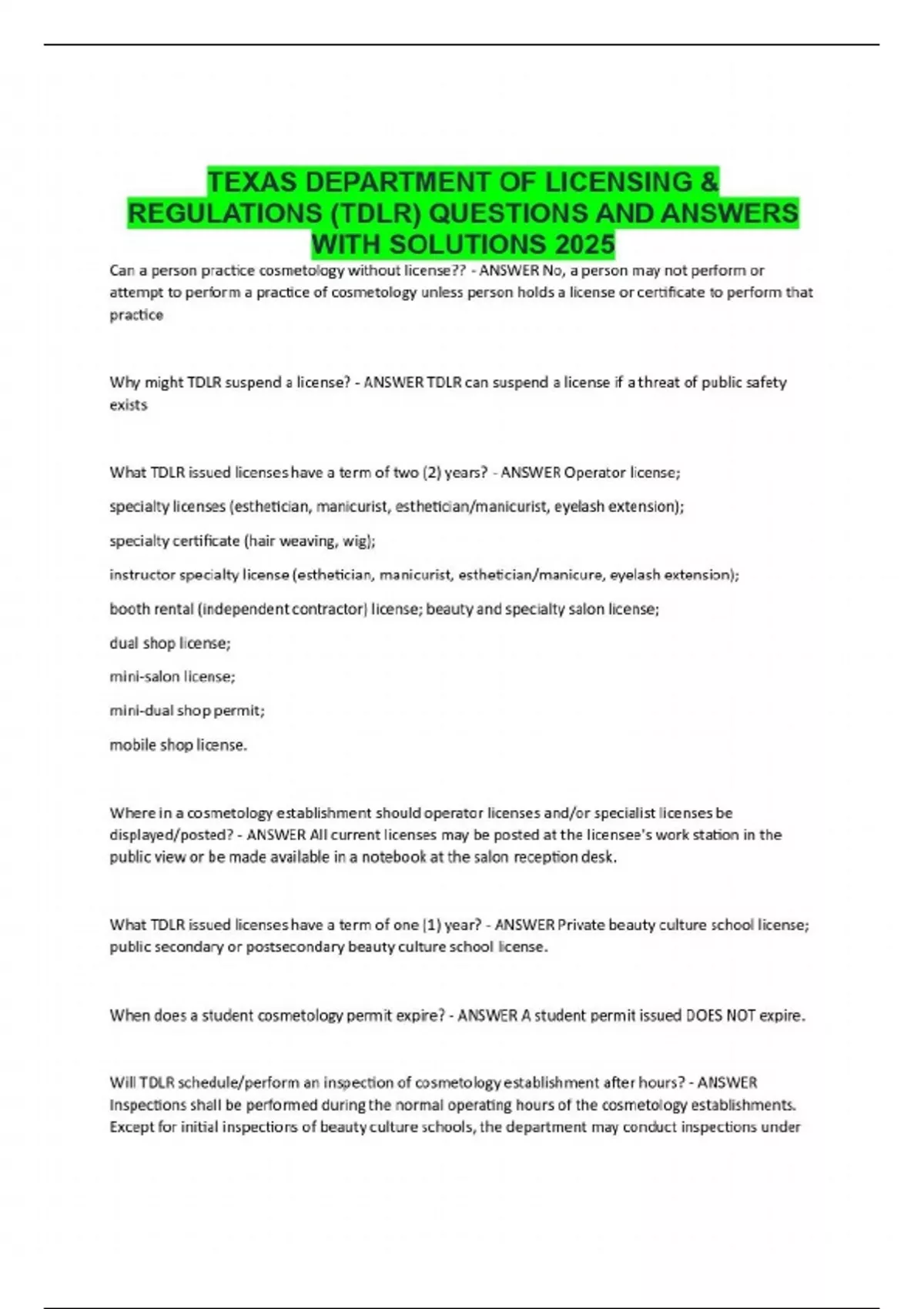 TEXAS DEPARTMENT OF LICENSING & REGULATIONS (TDLR) QUESTIONS AND ANSWERS WITH SOLUTIONS 2025