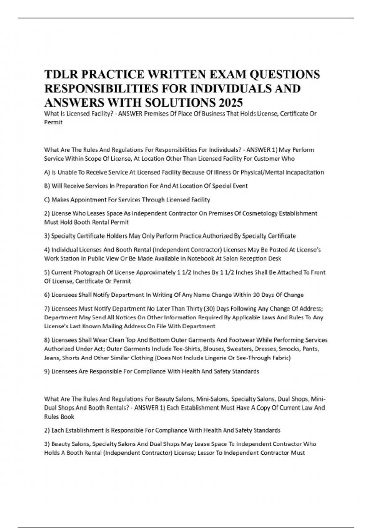 TDLR PRACTICE WRITTEN EXAM QUESTIONS RESPONSIBILITIES FOR INDIVIDUALS AND ANSWERS WITH SOLUTIONS 2025