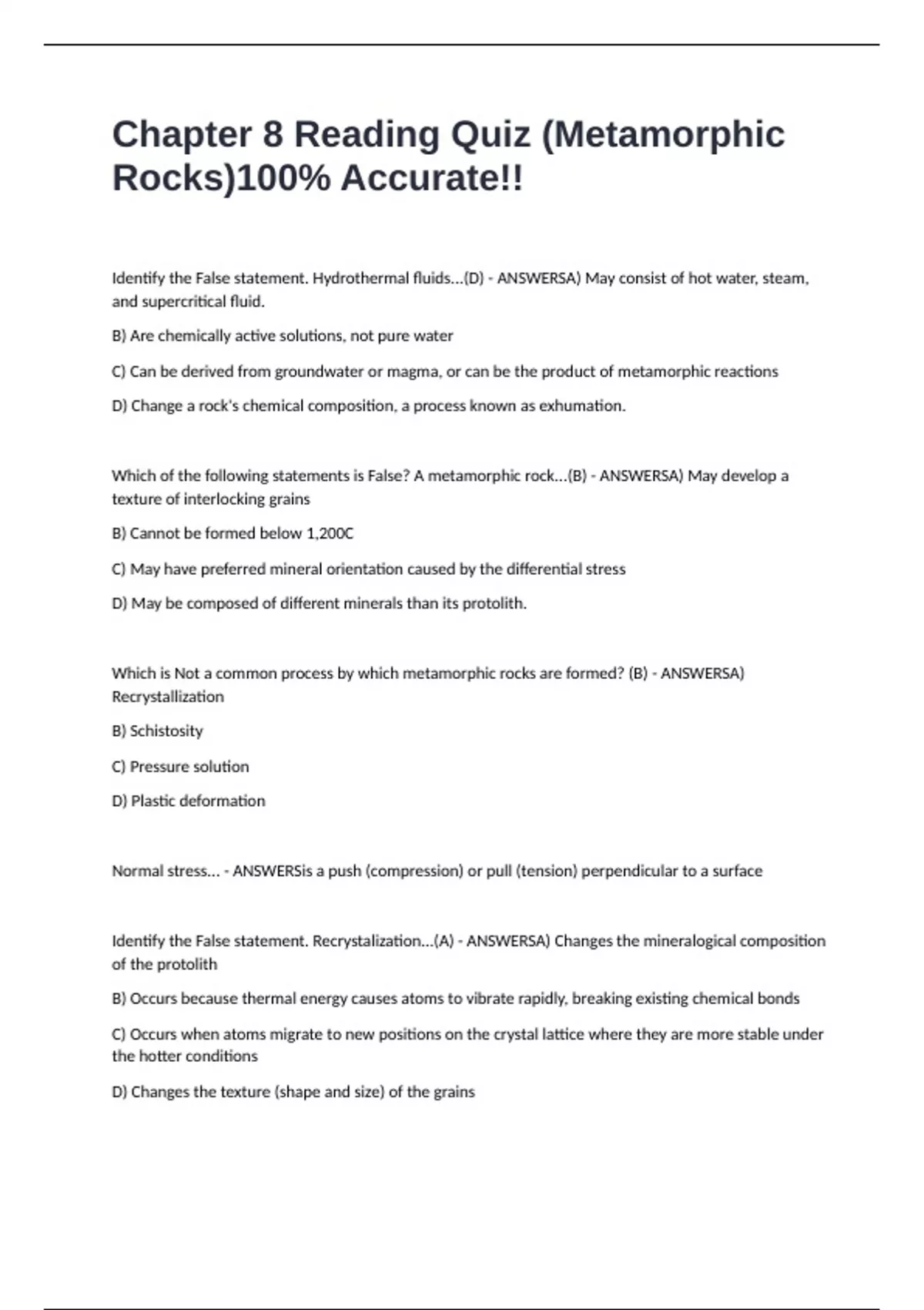 Which of the following statements is False? A metamorphic rock...(B) - ANSWERSA) May develop a