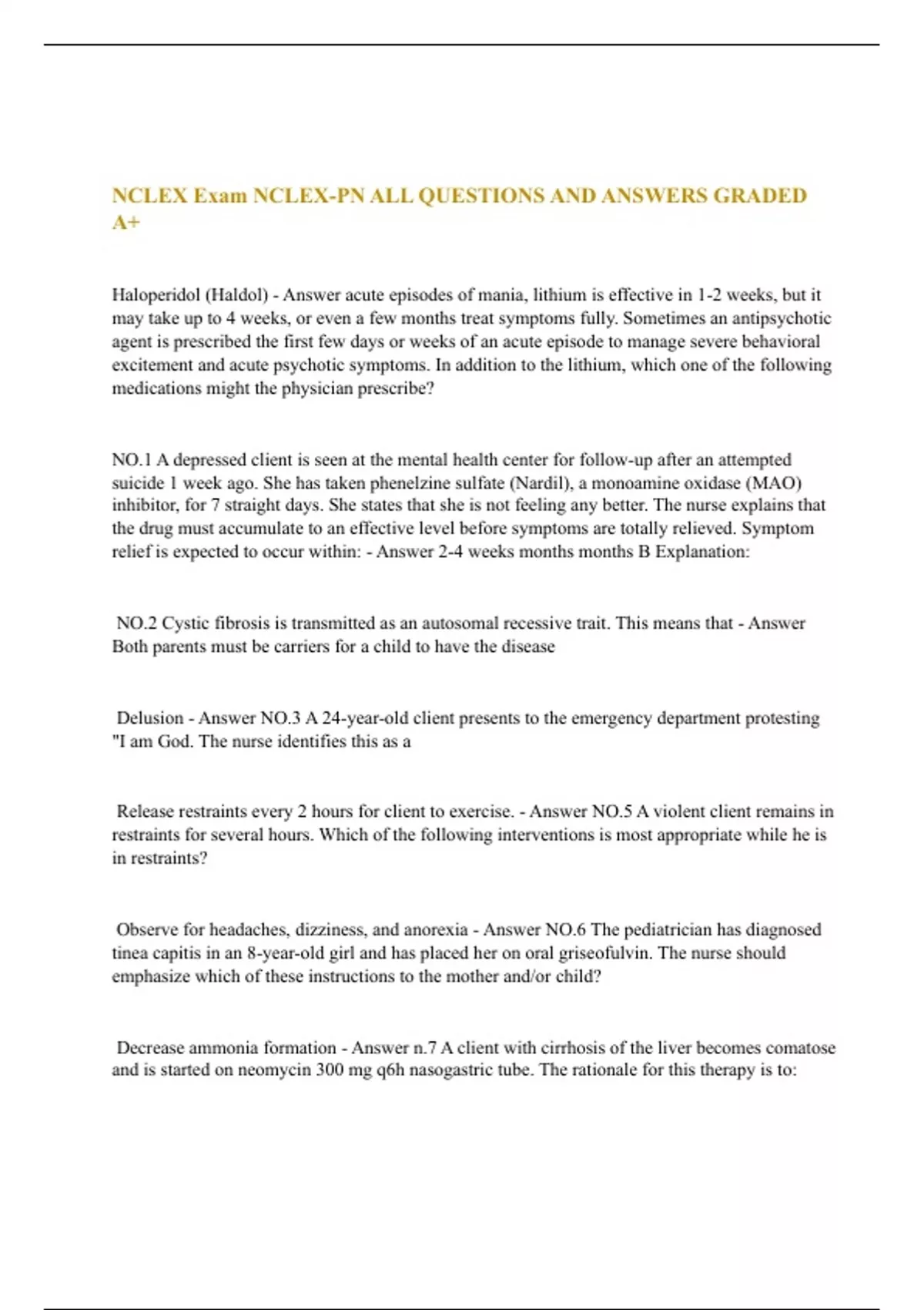 Release restraints every 2 hours for client to exercise. - Answer NO.5 A violent client remains in